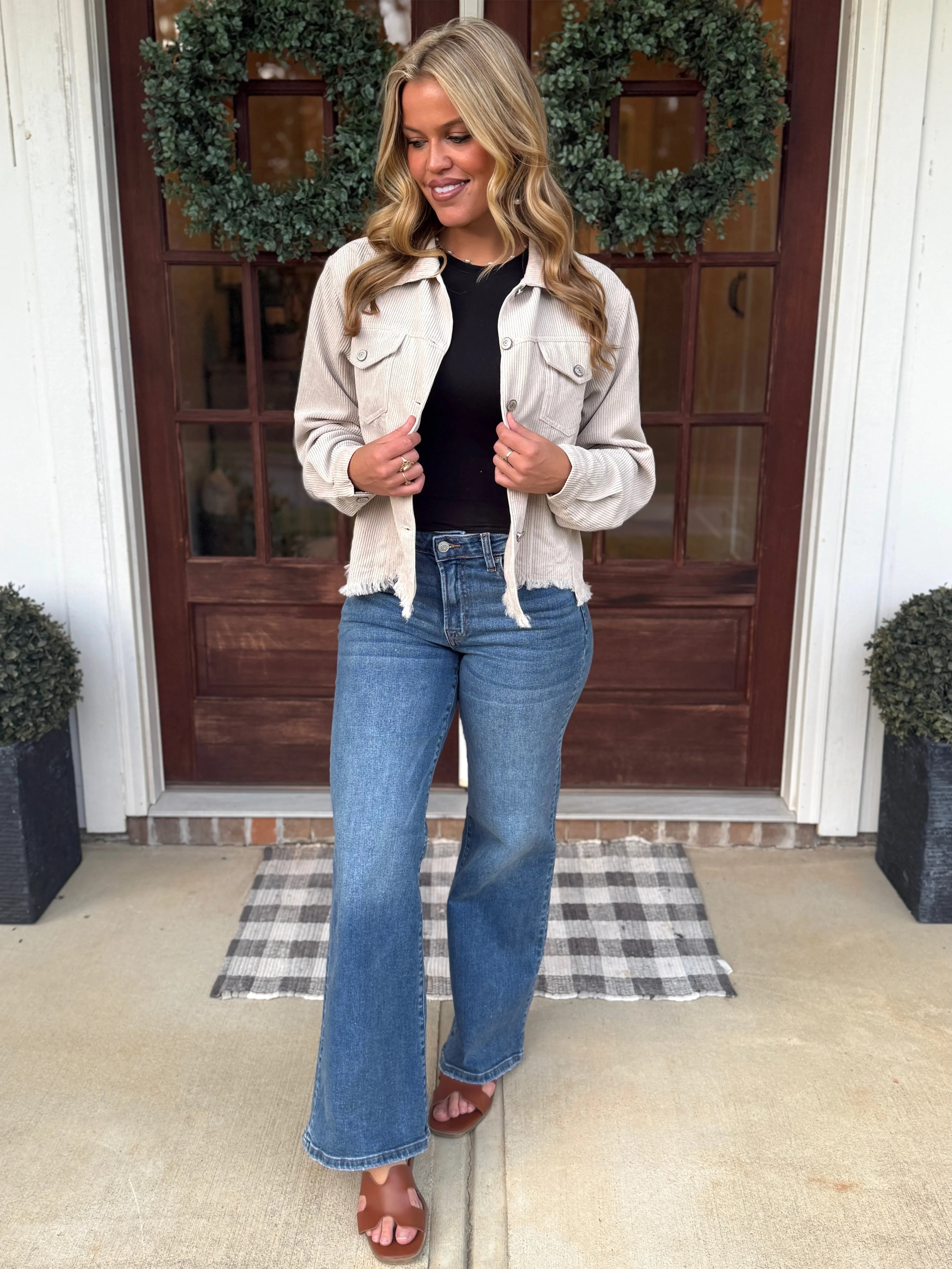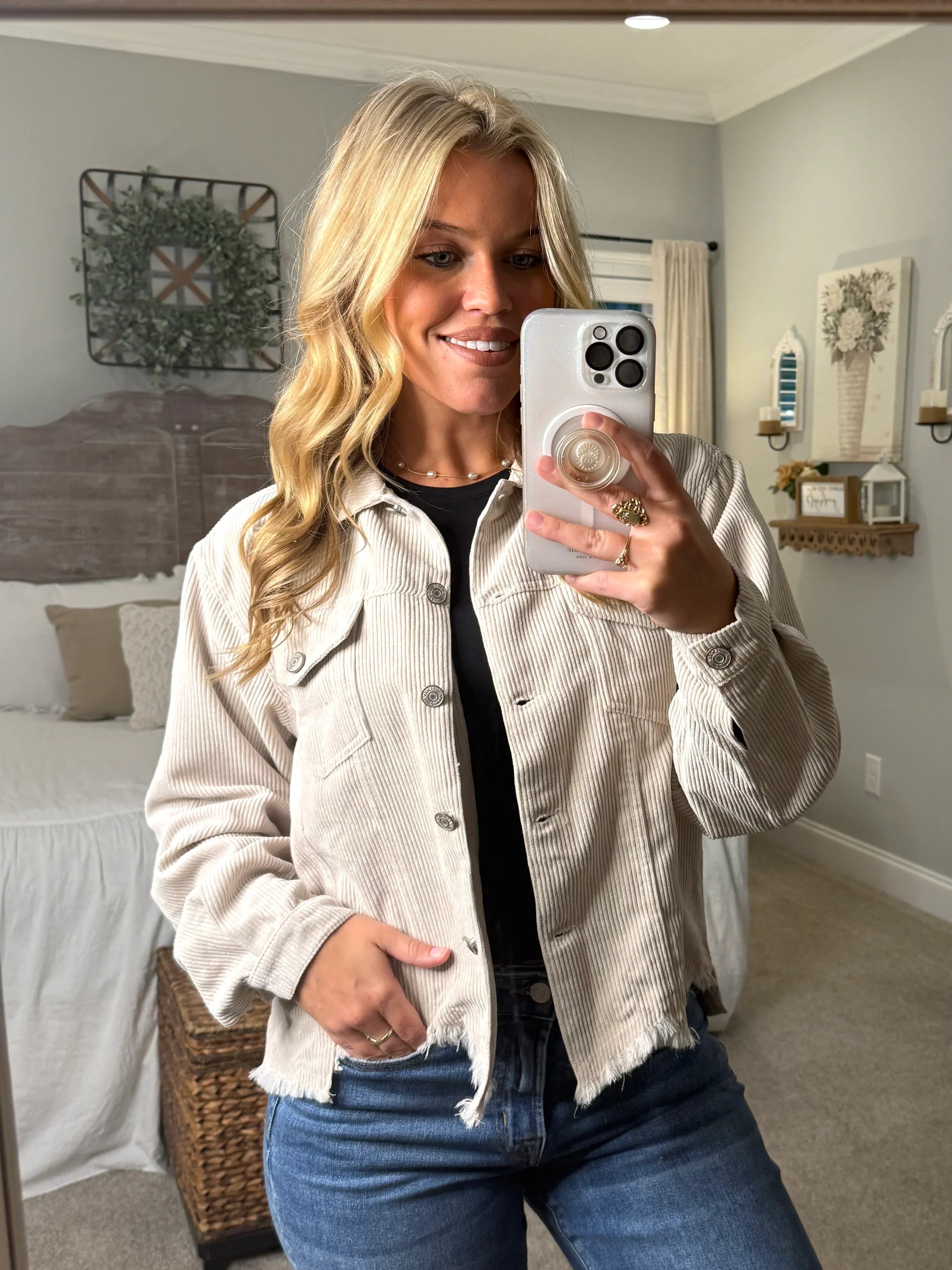 Add a dash of edge to your outfit with the CHARLOTTE Cropped Jacket in beige. Featuring a distressed corduroy texture and frayed hem, this playful jacket is perfect for layering over your favorite tops. Its cropped style keeps things fun and flirty, adding a unique touch to your casual look.
