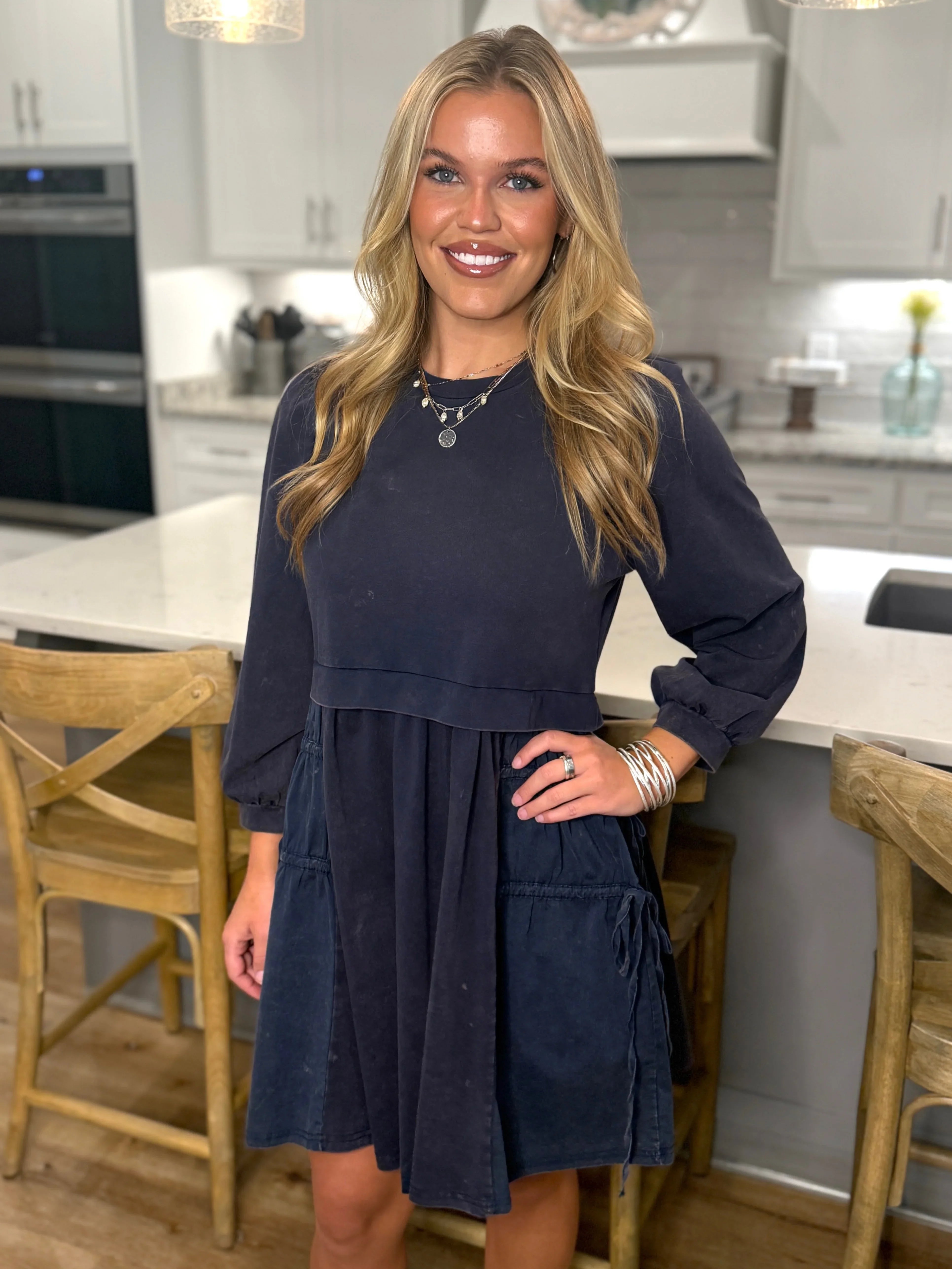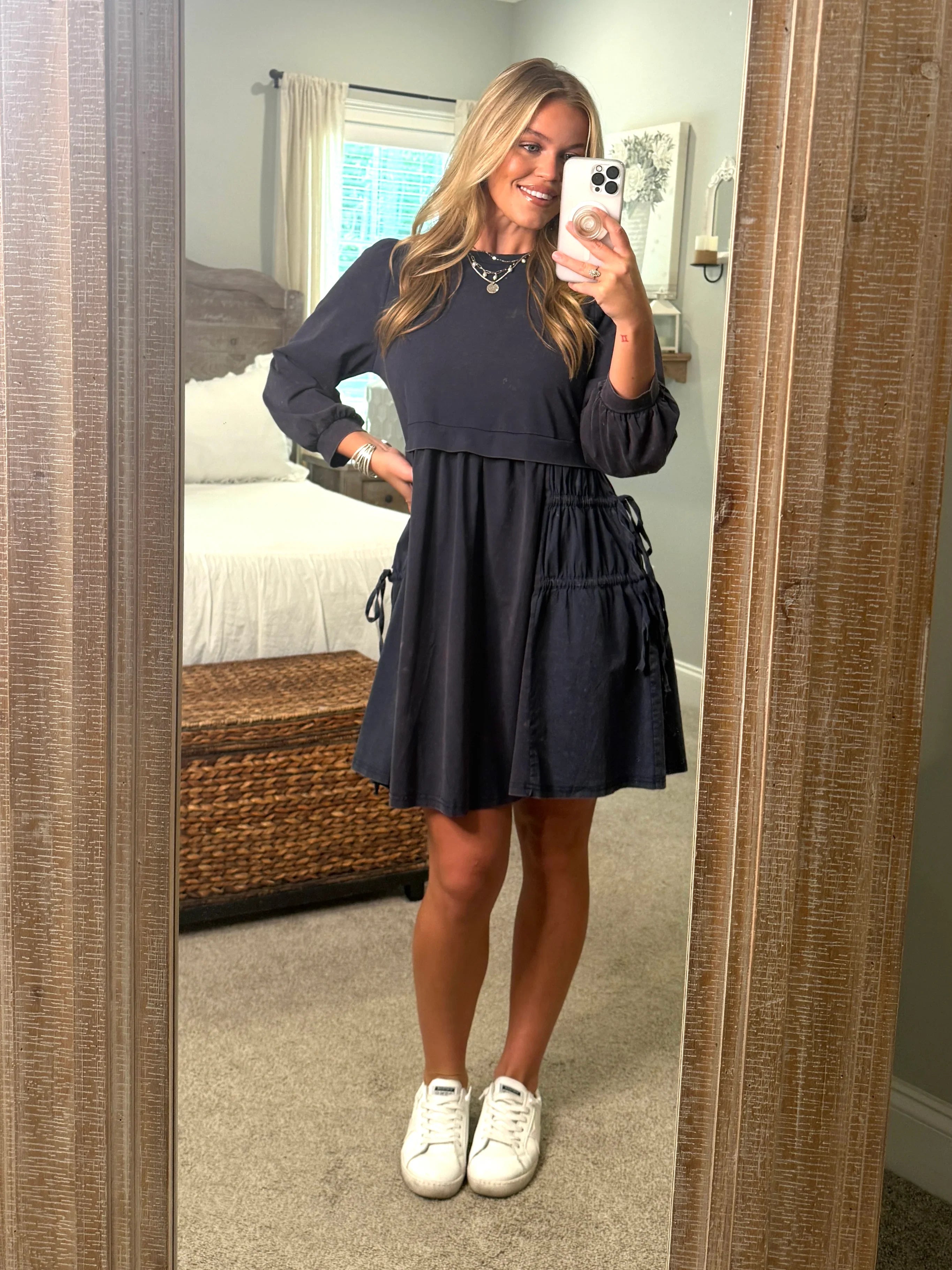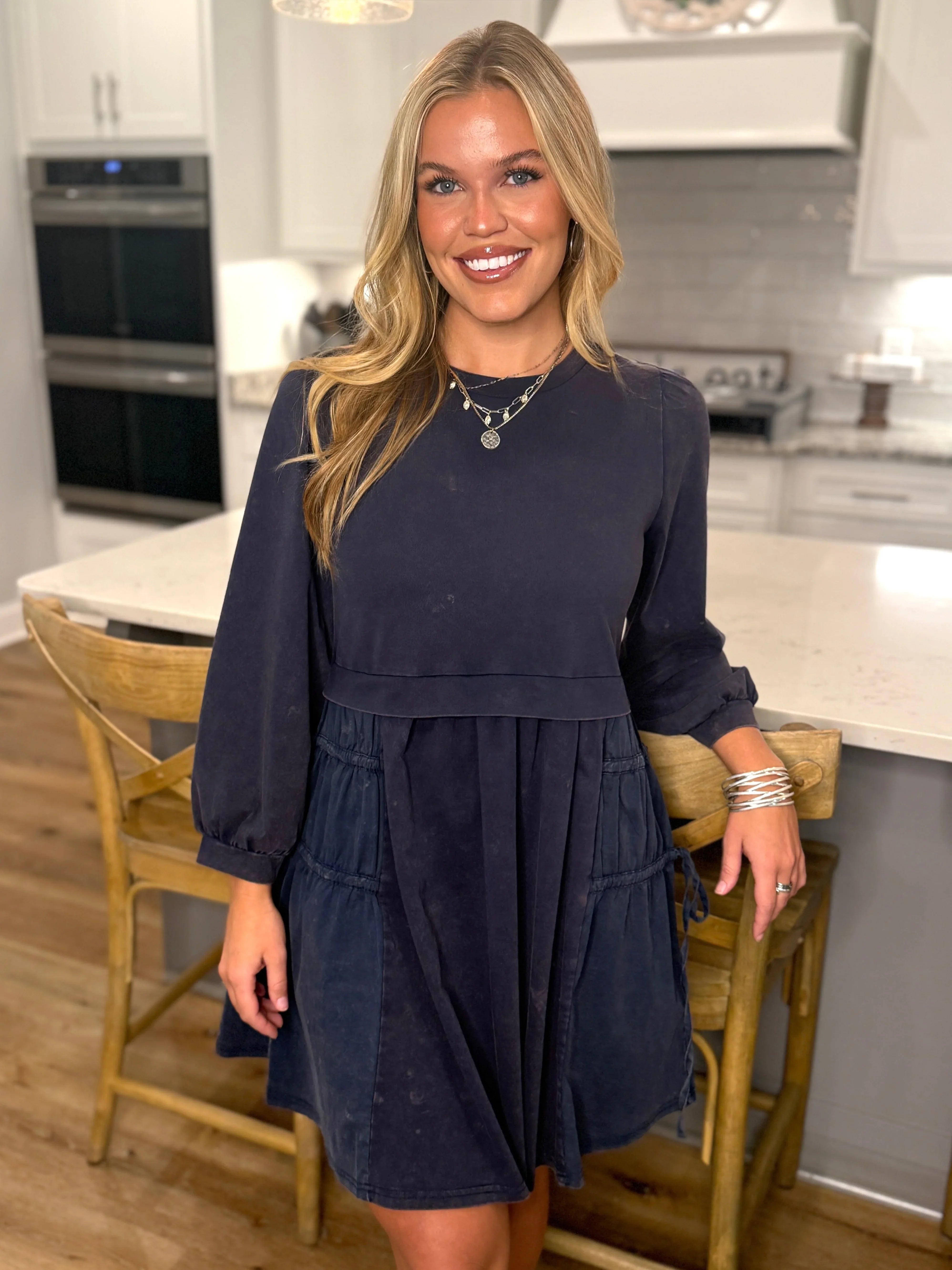 This adorable navy blue baby doll dress features a cozy U-neck and playful three-quarter bubble sleeves with neat band cuffs. Made from lightweight, non-sheer cotton, it offers all-day comfort while the drawstring woven skirt adds a fun, adjustable flair. Perfect for twirling and everyday adventures!