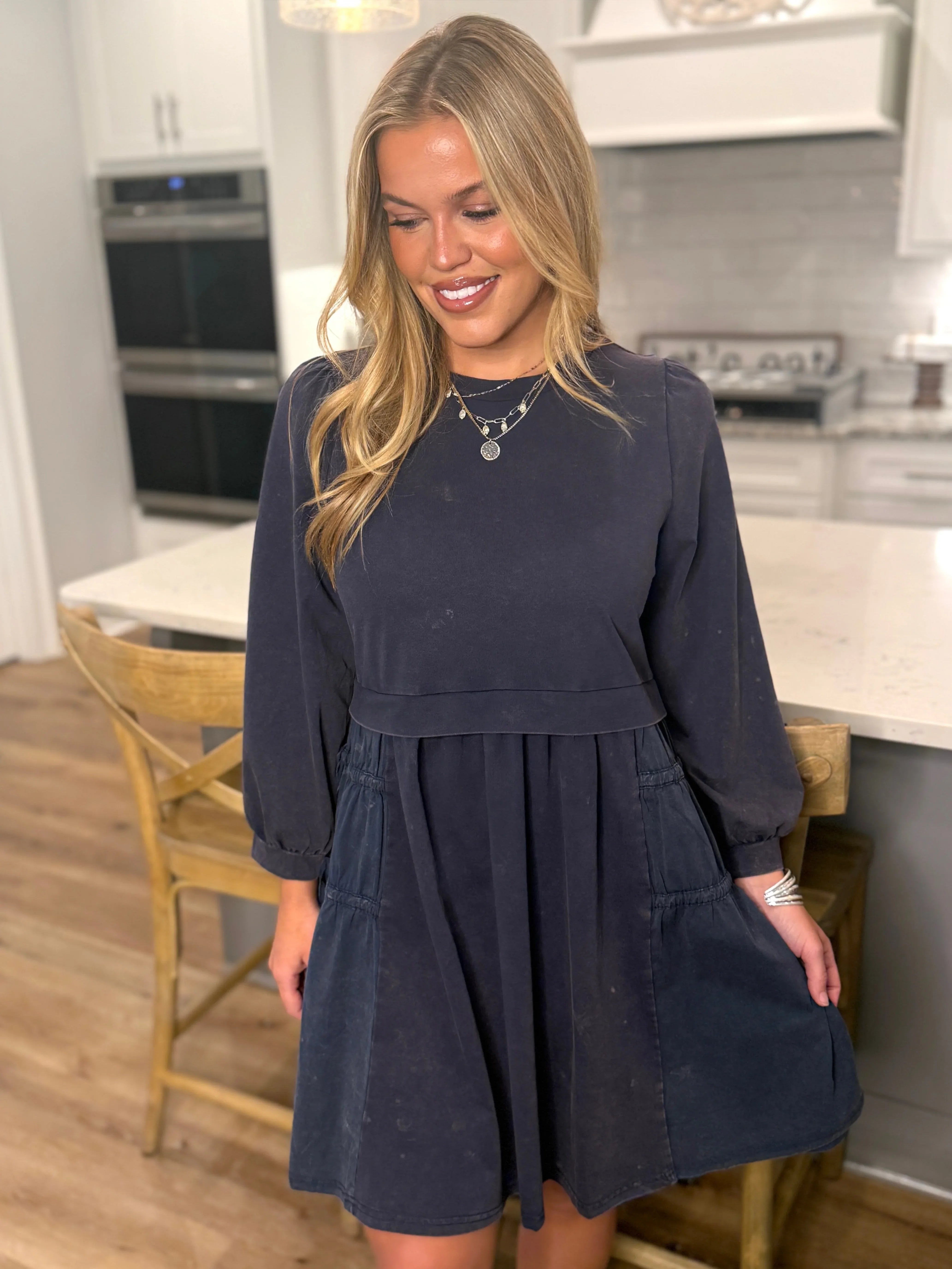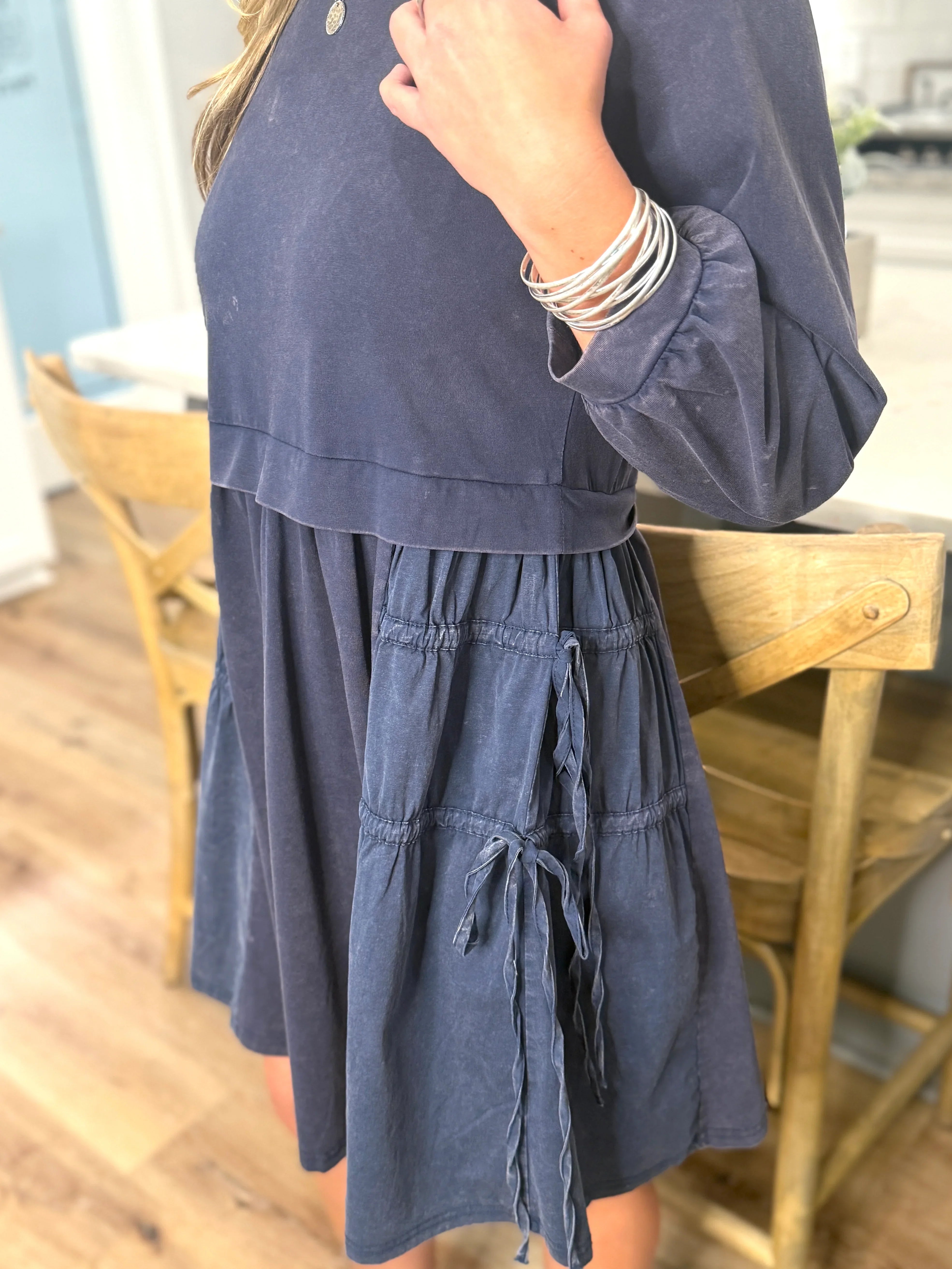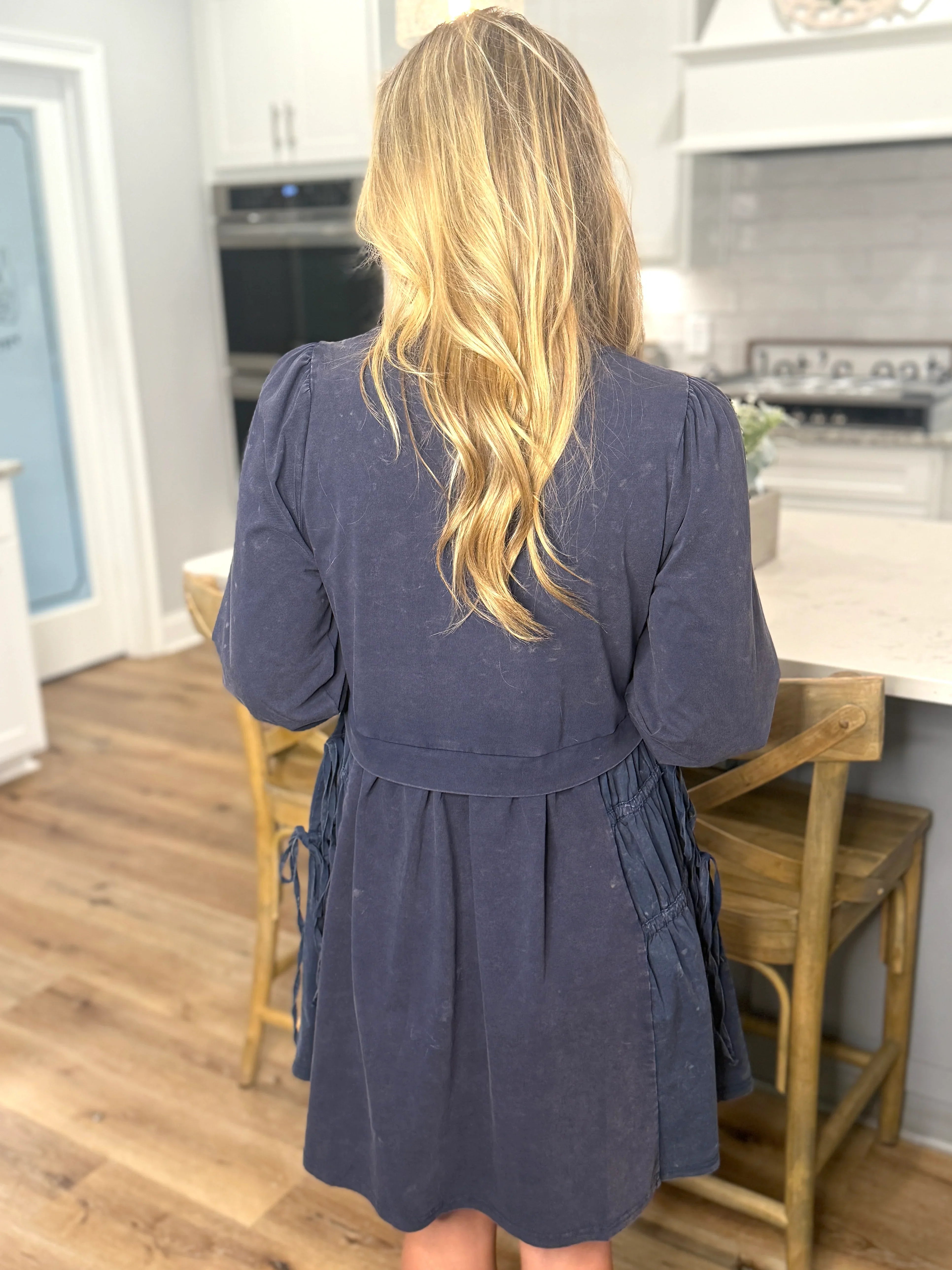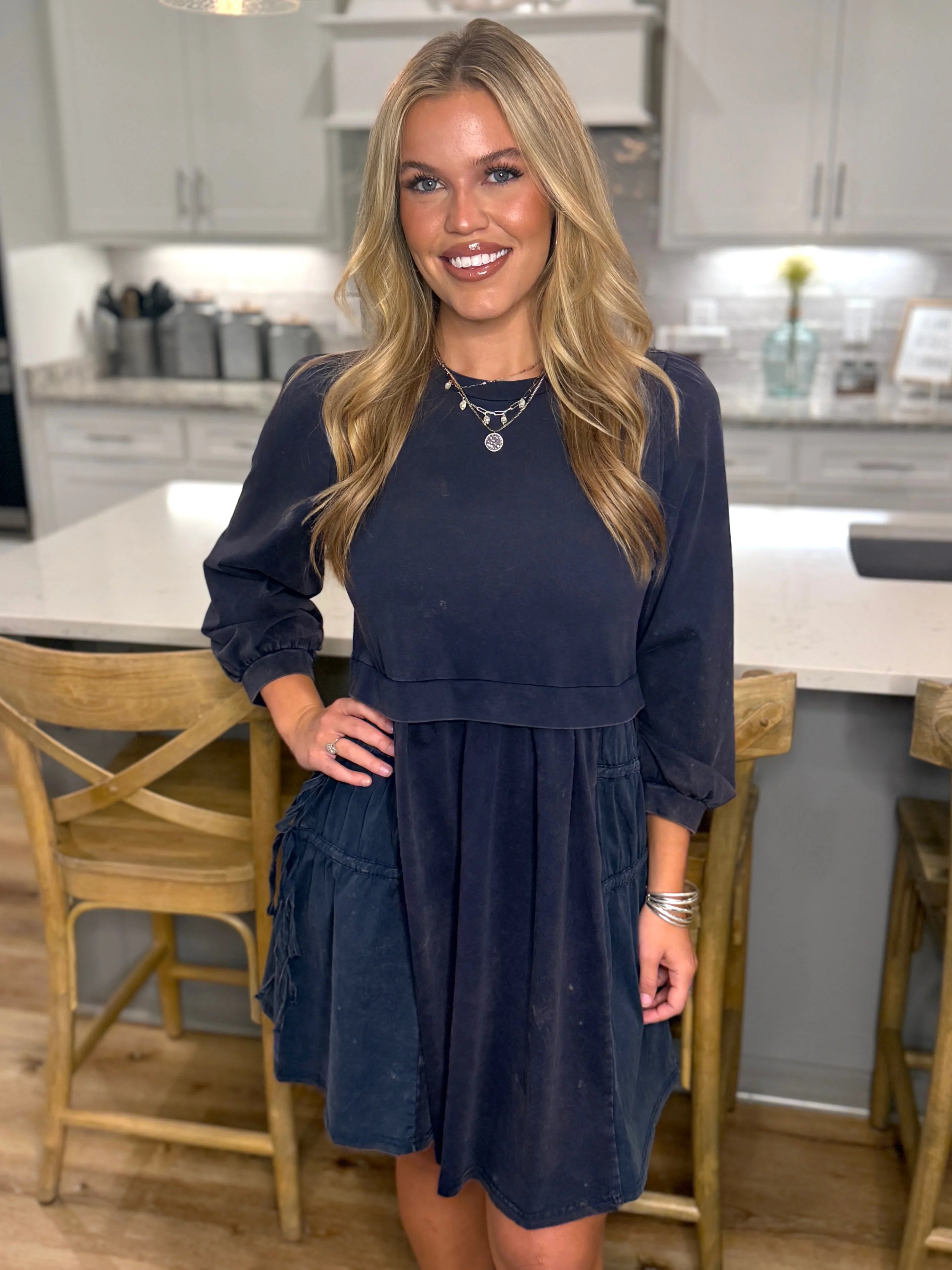 This adorable navy blue baby doll dress features a cozy U-neck and playful three-quarter bubble sleeves with neat band cuffs. Made from lightweight, non-sheer cotton, it offers all-day comfort while the drawstring woven skirt adds a fun, adjustable flair. Perfect for twirling and everyday adventures!