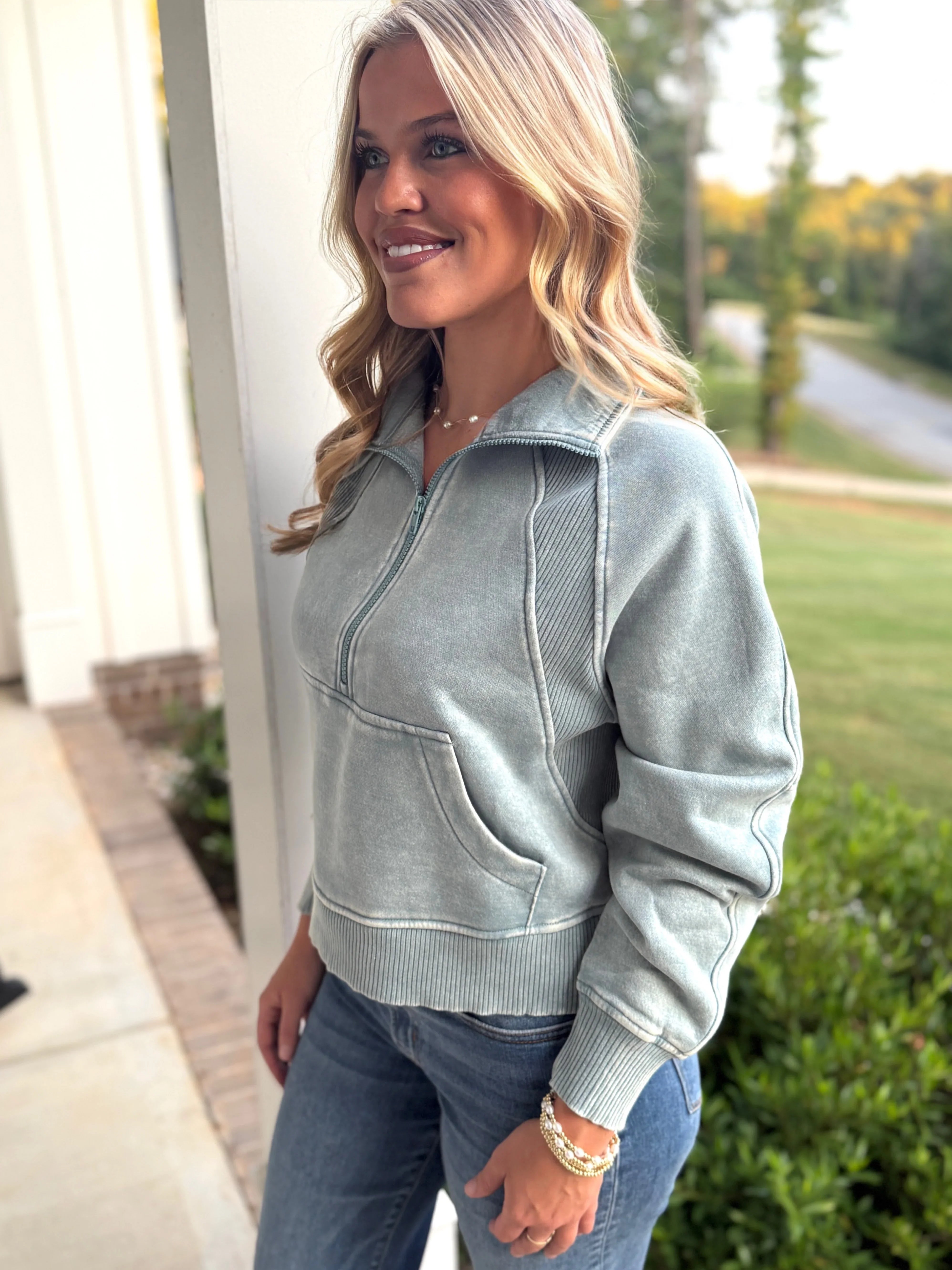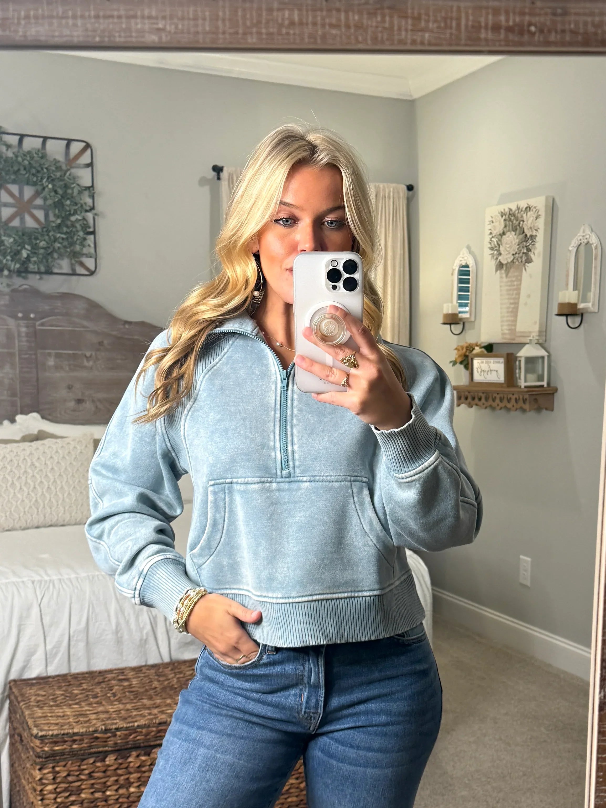 Wrap yourself in cozy vibes with the HARMONY Half Zip Pullover in Blue. This acid-washed fleece features a fun half-zip design and a roomy kangaroo pocket—perfect for keeping your hands warm or stashing your essentials. Whether you're lounging at home or out on an adventure, this pullover brings effortless comfort with a playful twist.