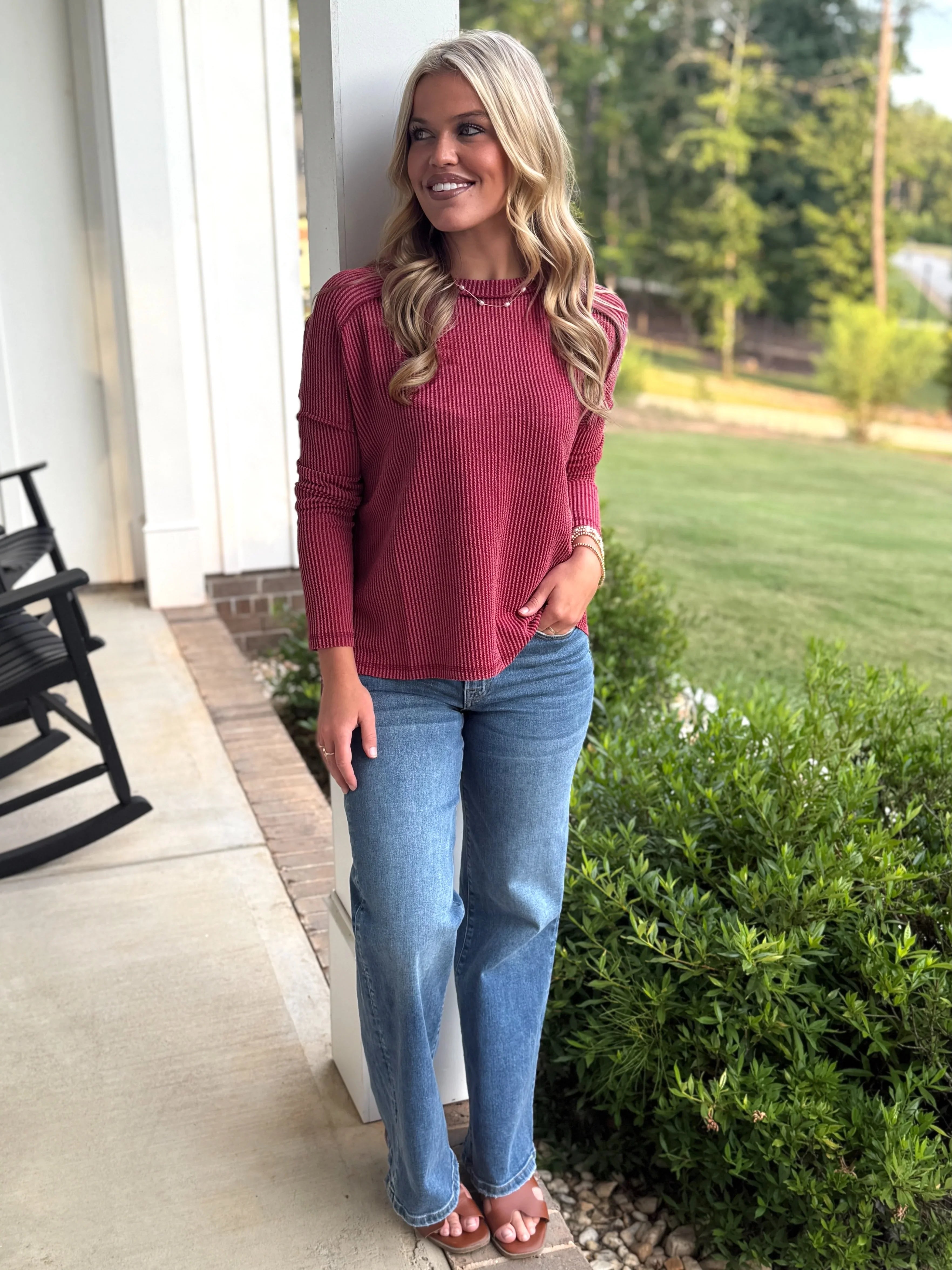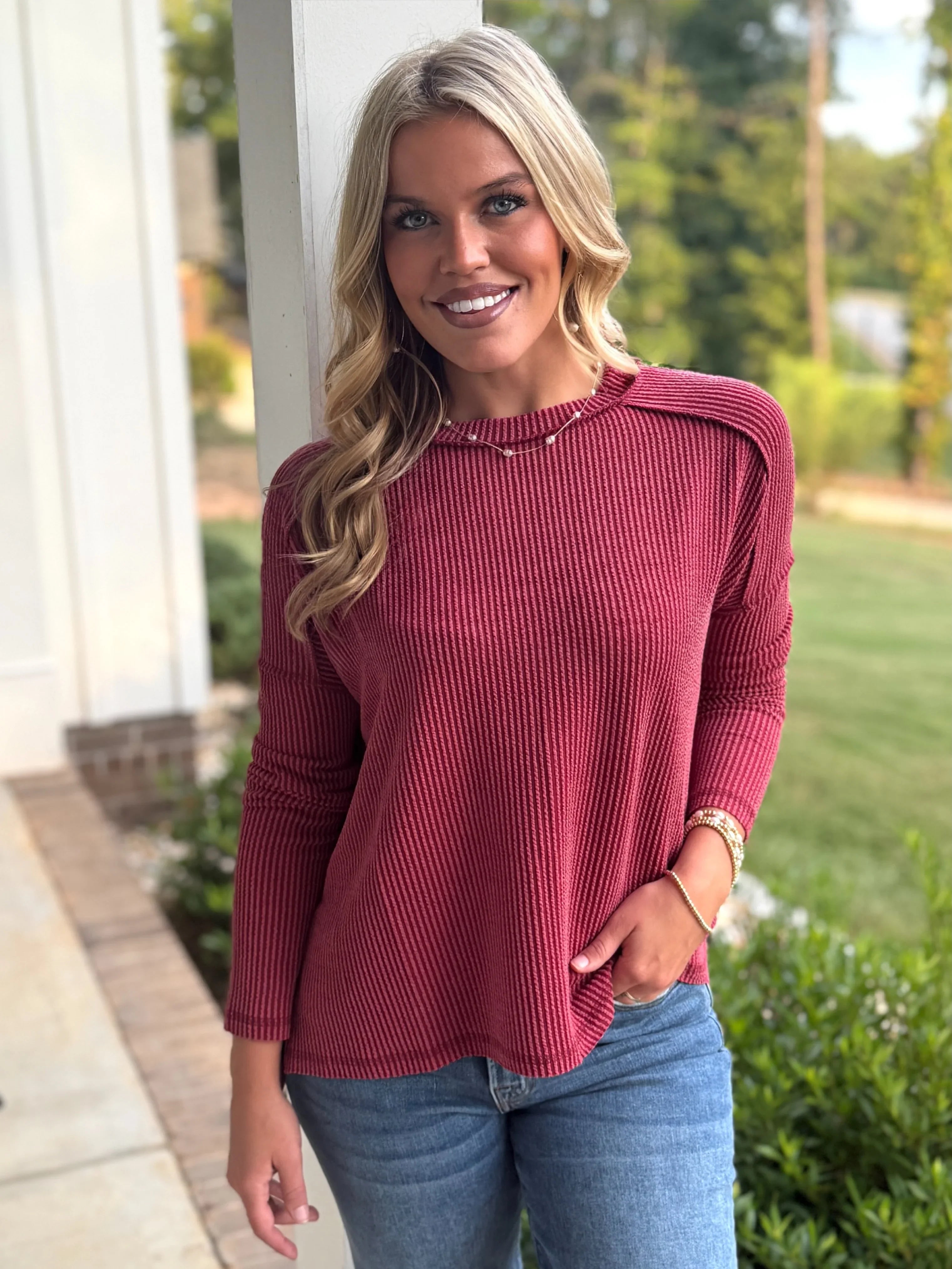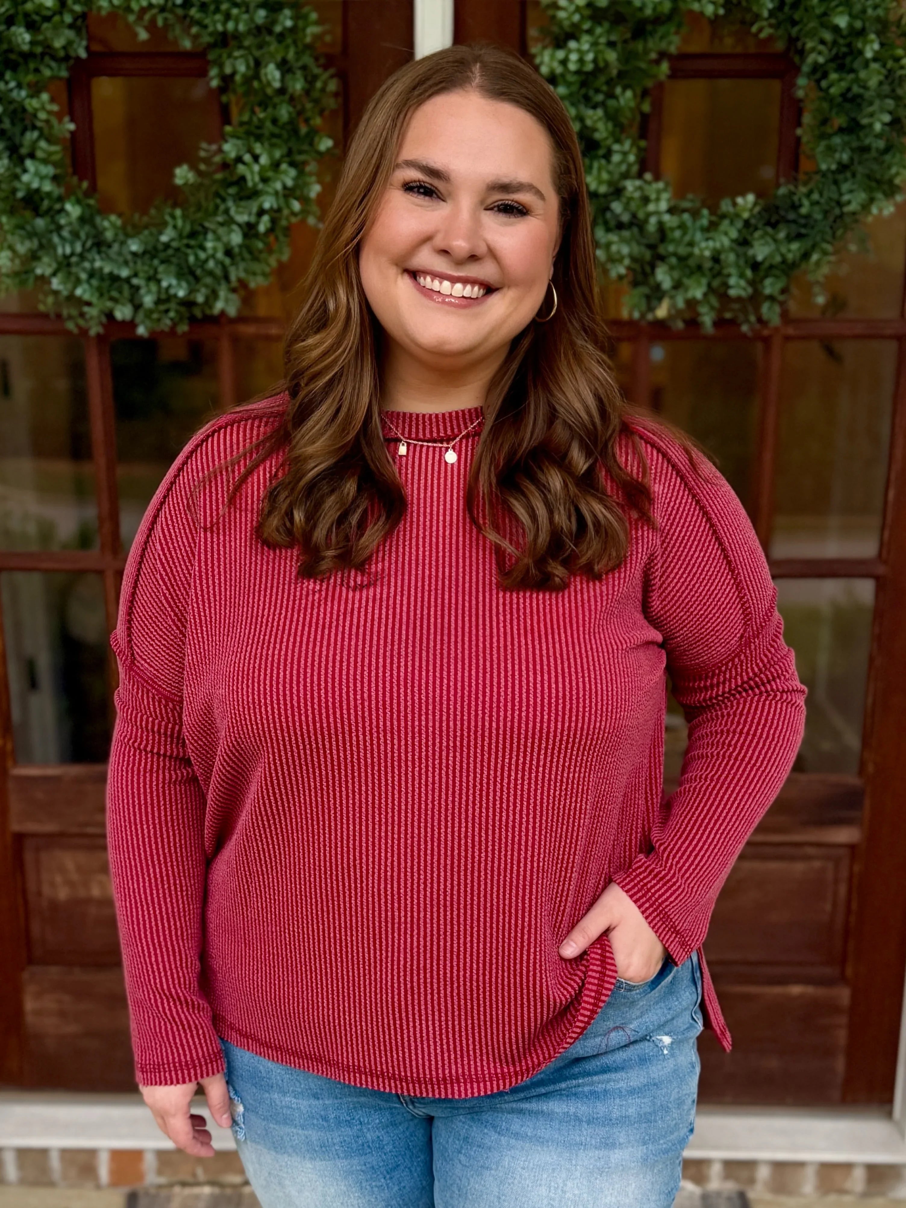 Get cozy in the SAMANTHA Raised Ribbed Top, designed with a chic raw edge boat neck and long sleeves. Its burgundy hue adds a pop of playful color, while the raised rib texture brings a touch of stylish dimension. Perfect for layering or wearing solo, this top hugs comfortably from S to 3X for a flattering fit that’s ready for anything.