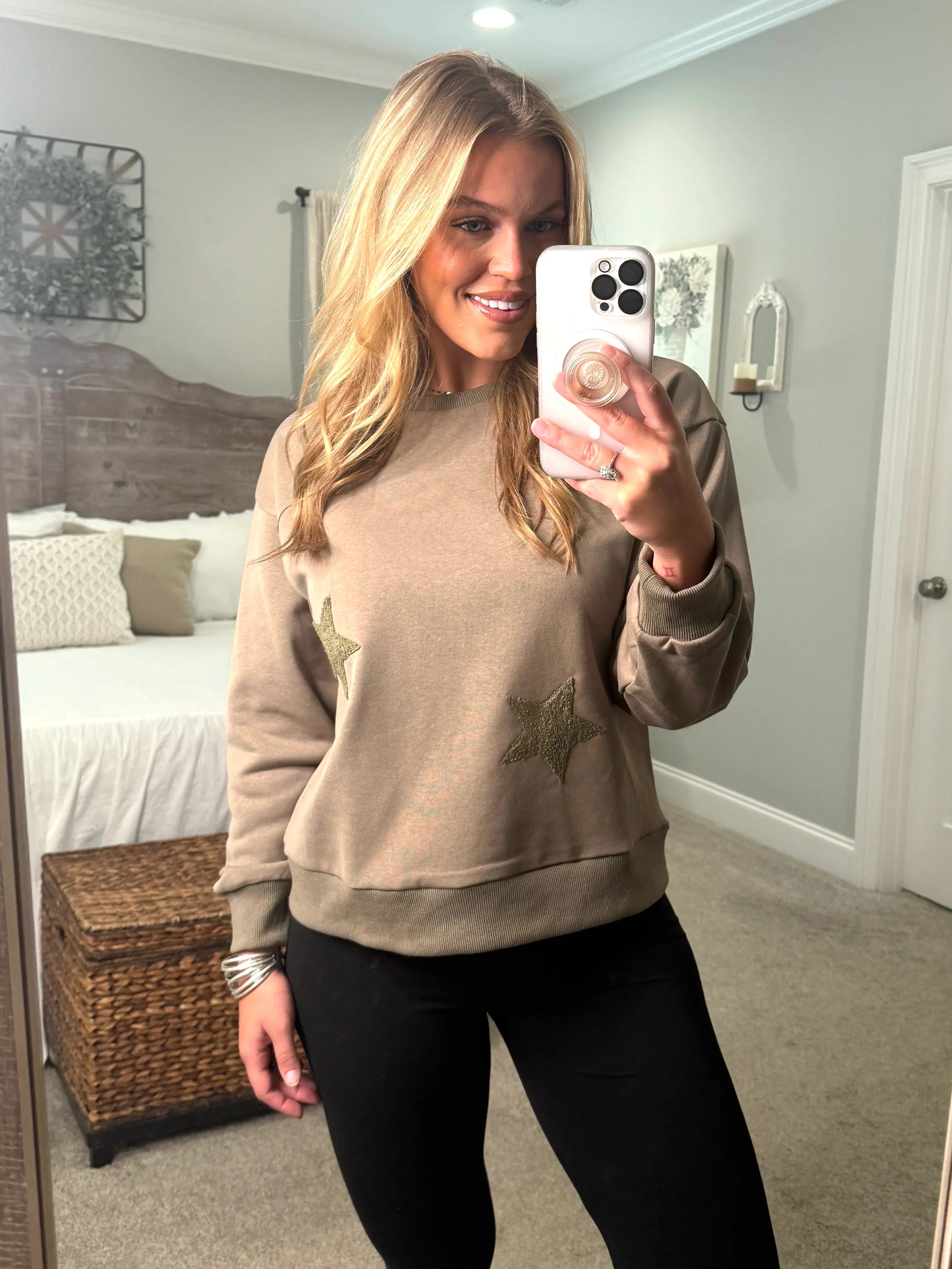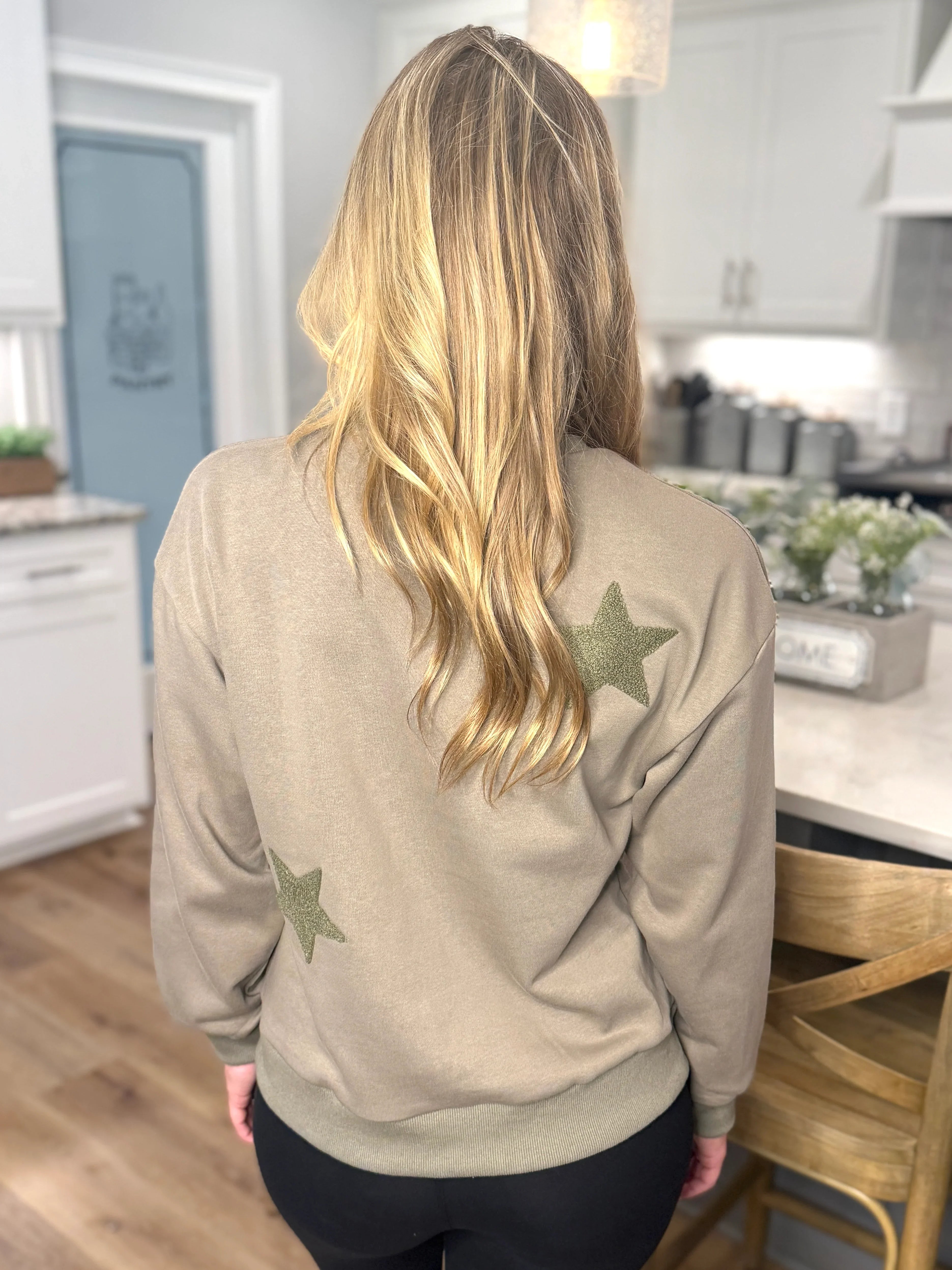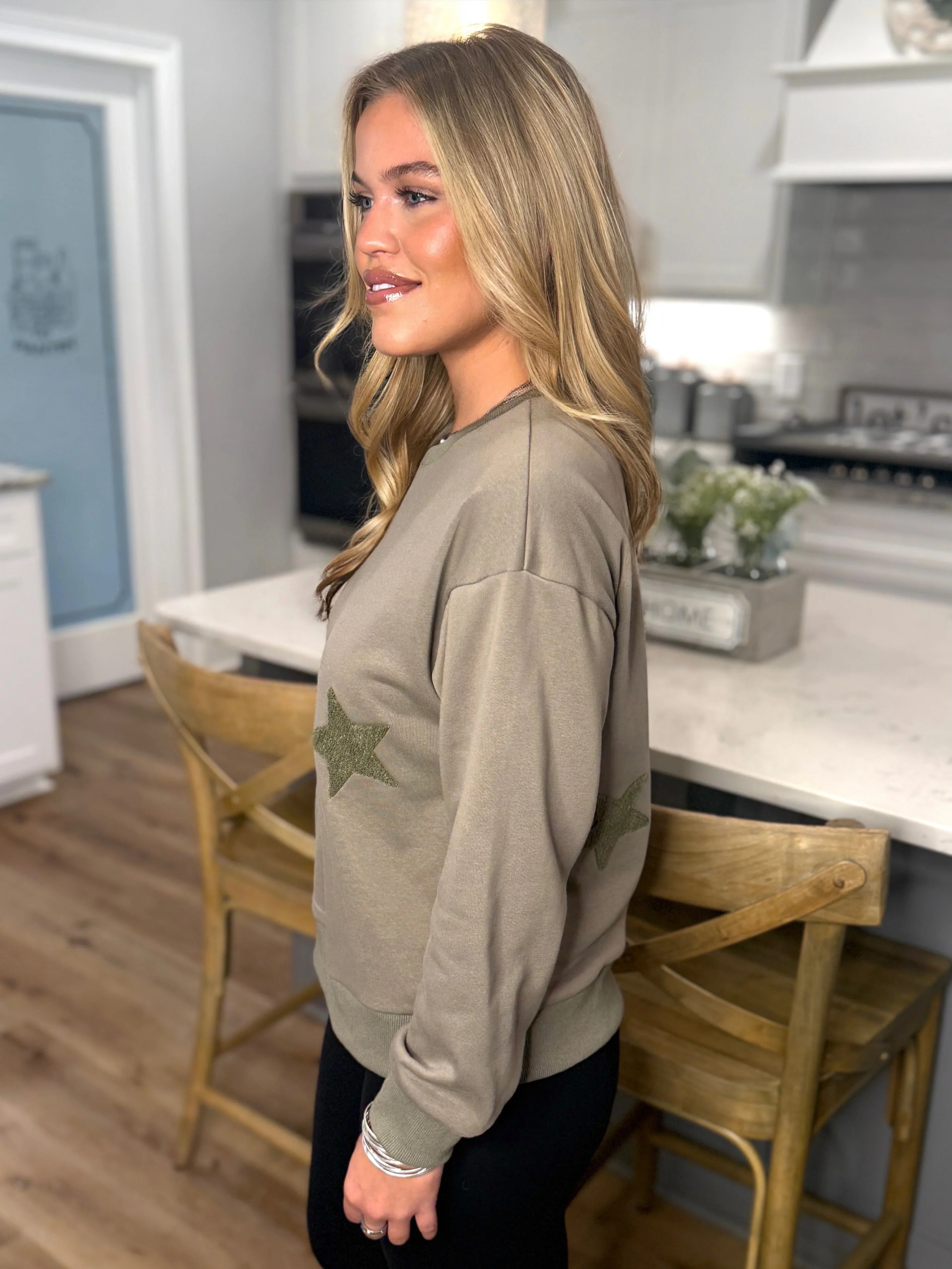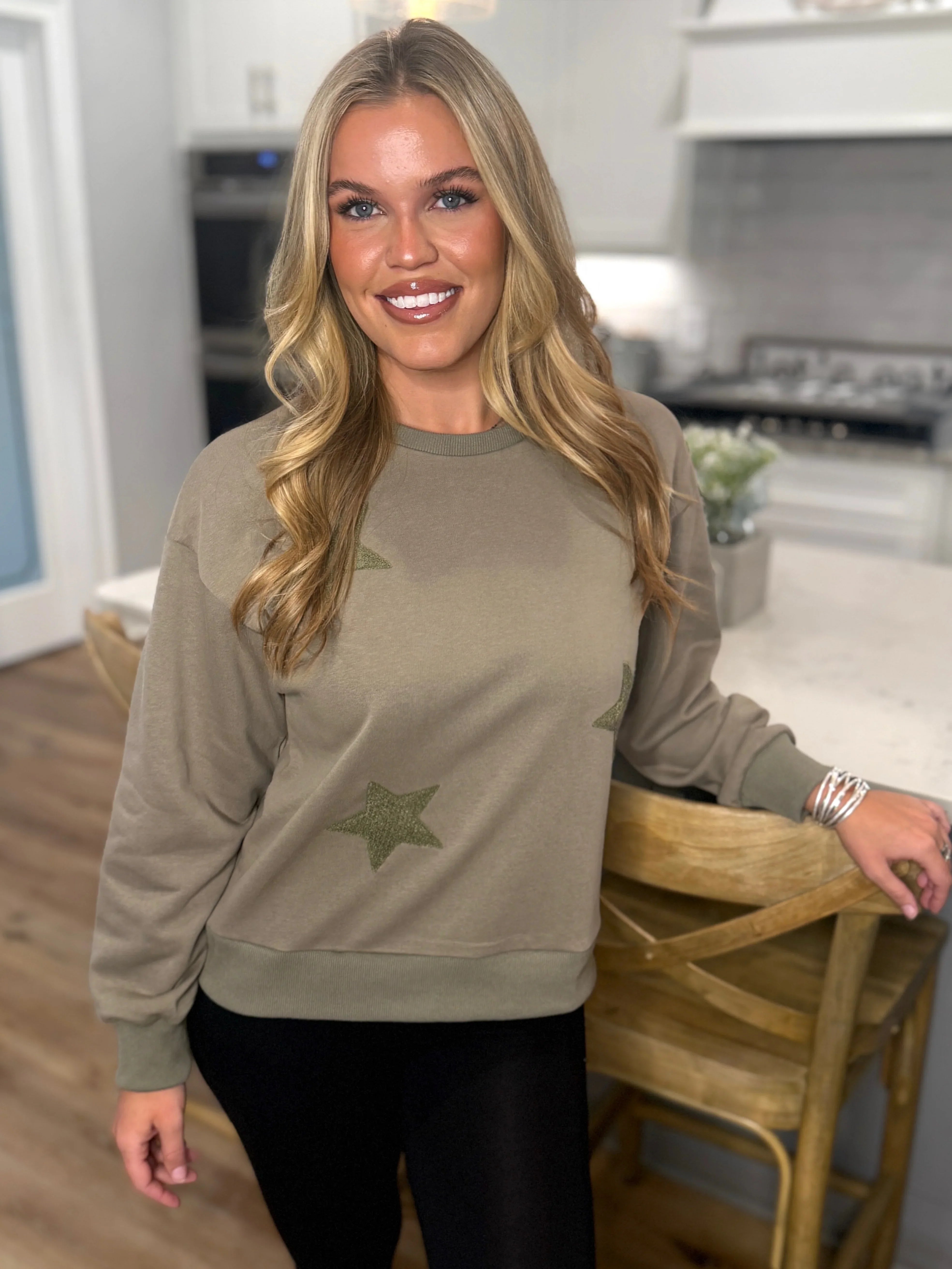 Add a dash of charm to your everyday style with the REESE Star Top in Olive. Featuring a comfy U-neck, relaxed drop shoulders, and long sleeves with ribbed hems, this lightweight sweatshirt is perfect for casual days with a playful twist. Its non-sheer fabric ensures easy layering, while the star patch adds a fun, standout detail.