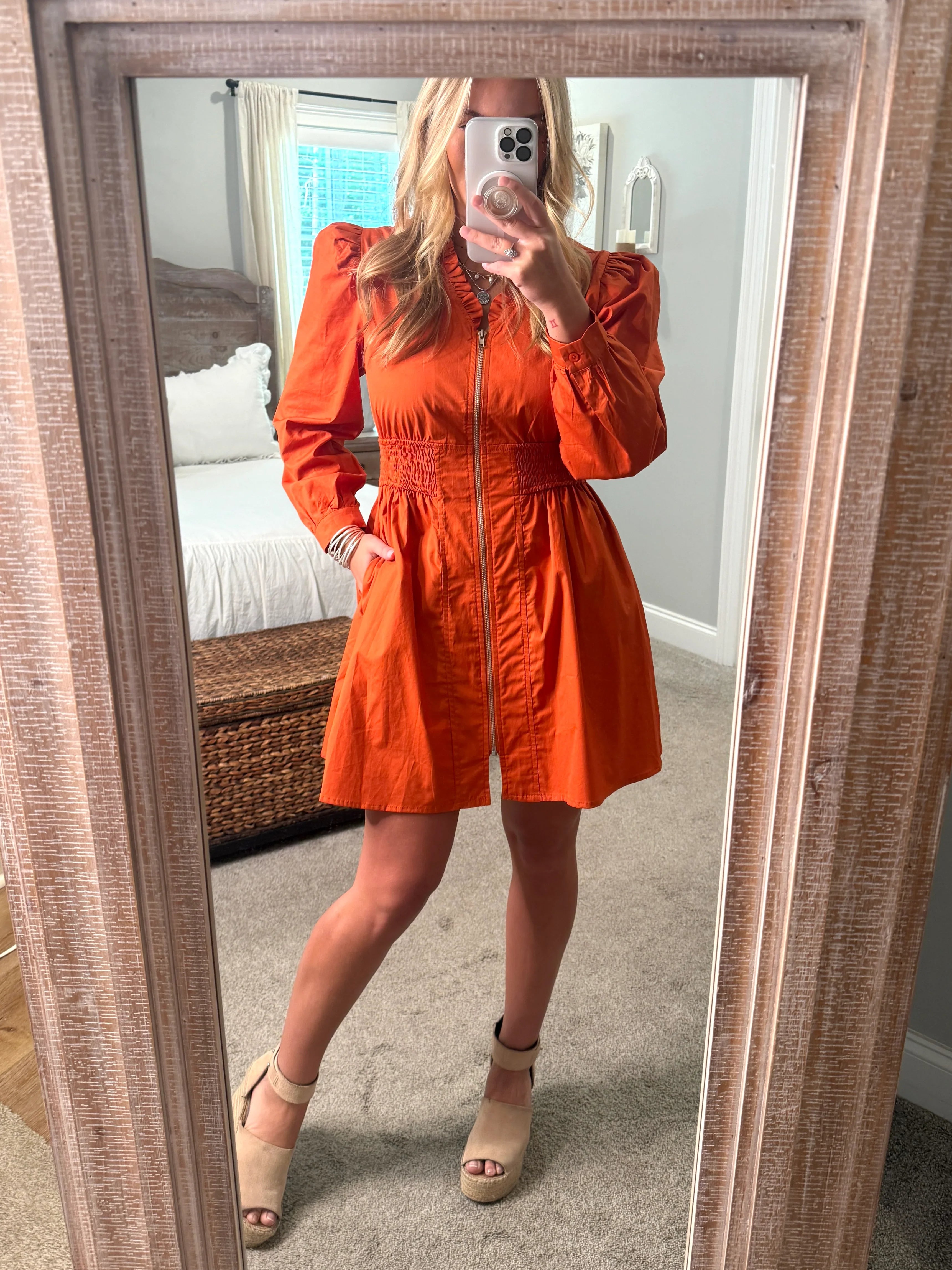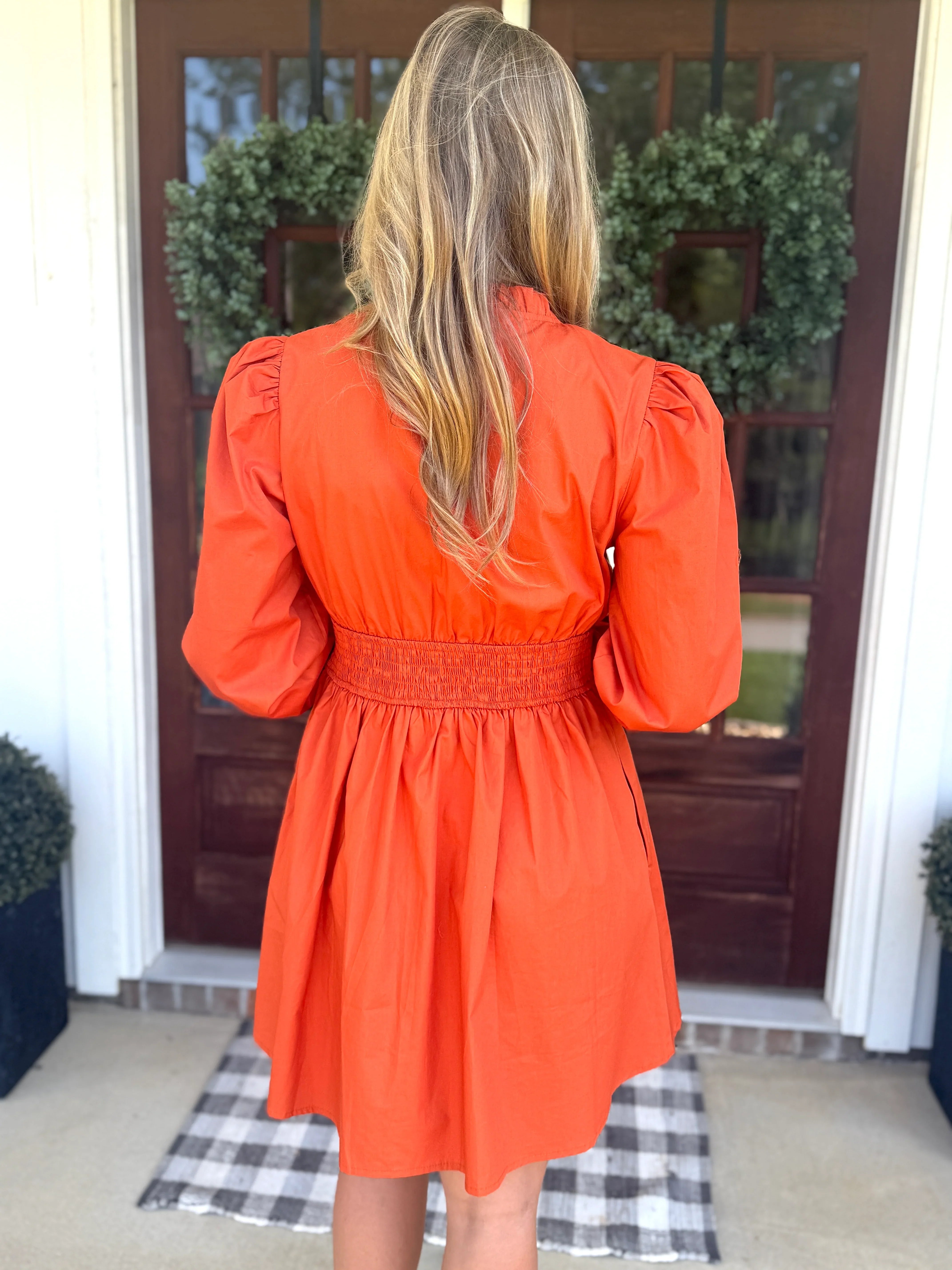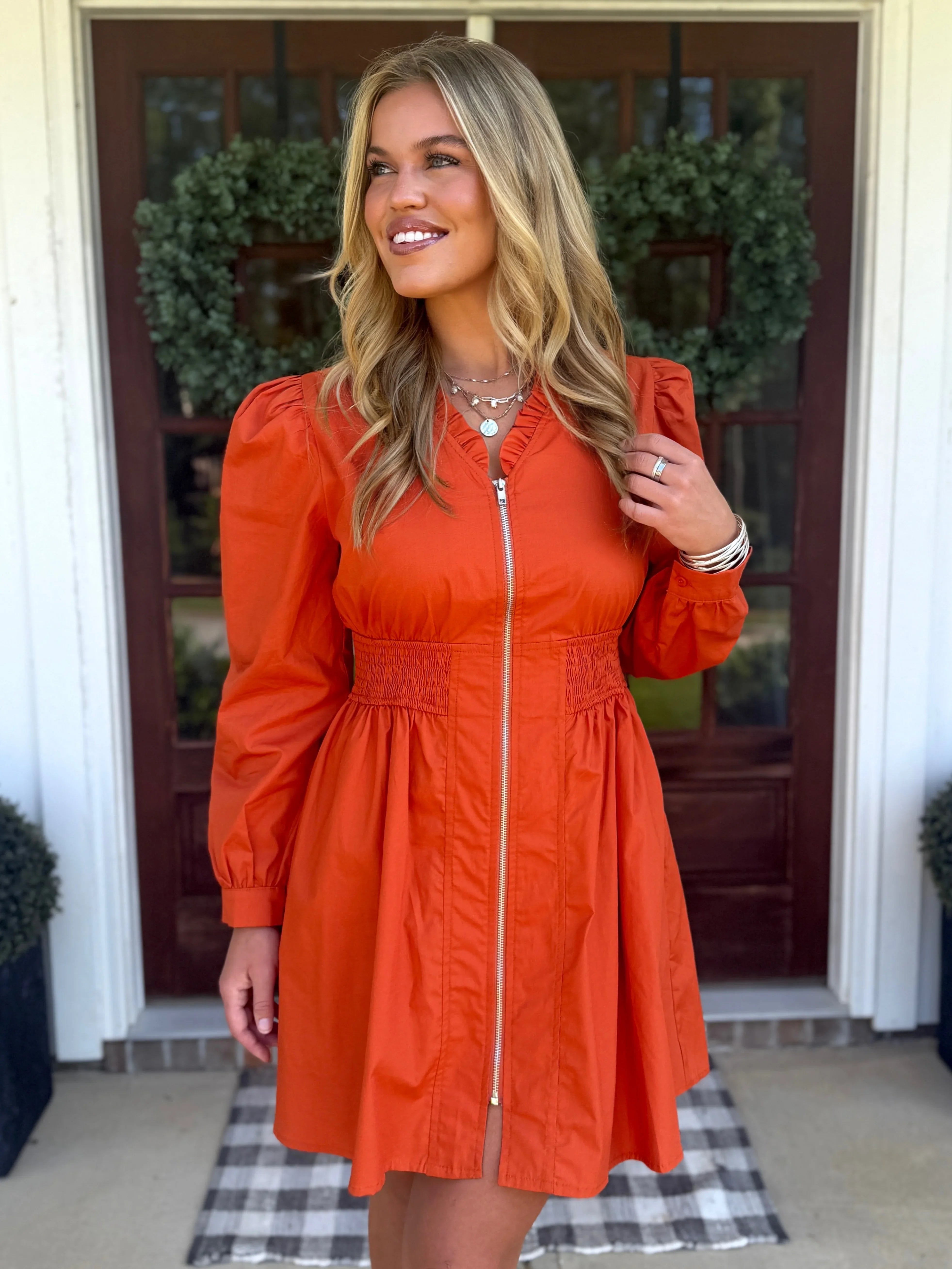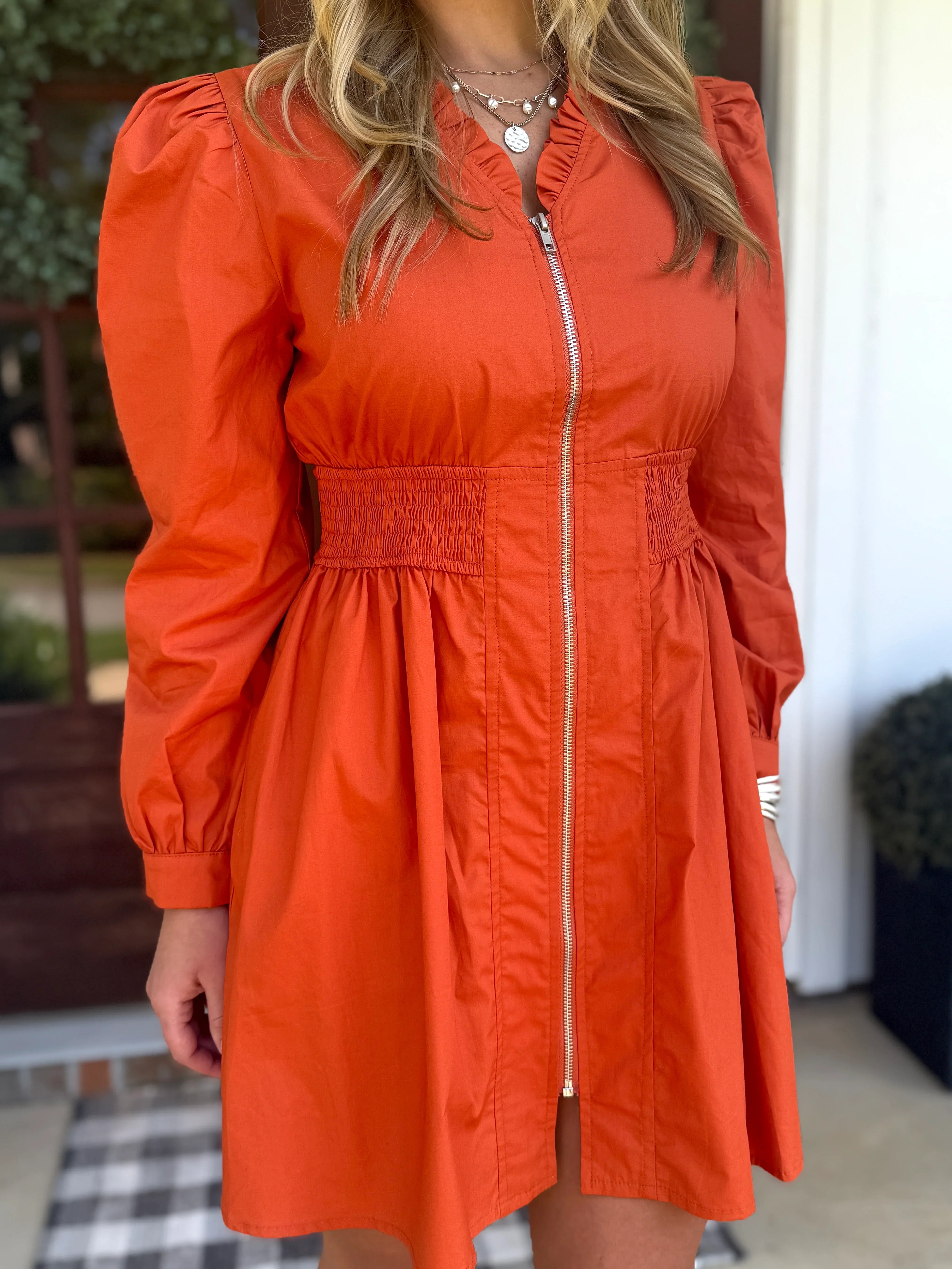 Step into sunshine with the MILANI Zipper Dress in Burnt Orange. This playful cotton dress features a flirty frilled V-neck and a smocked waistline that hugs just right. Lightweight poplin and voluminous blouson sleeves add a touch of whimsy, while buttoned cuffs keep things charmingly neat. With a handy zip closure and side pockets, it’s as practical as it is stylish—perfect for twirling through warm or cool days with ease!