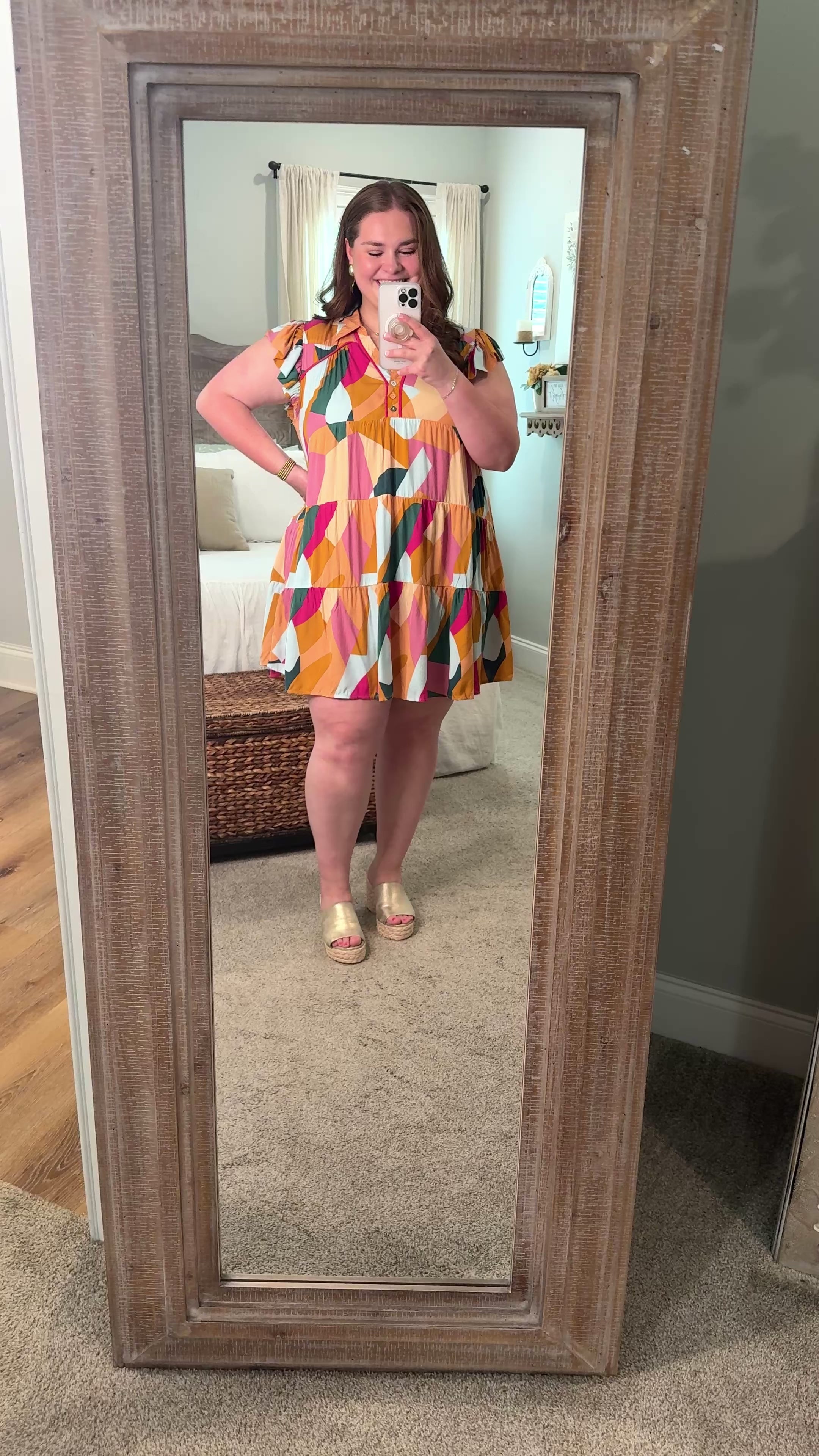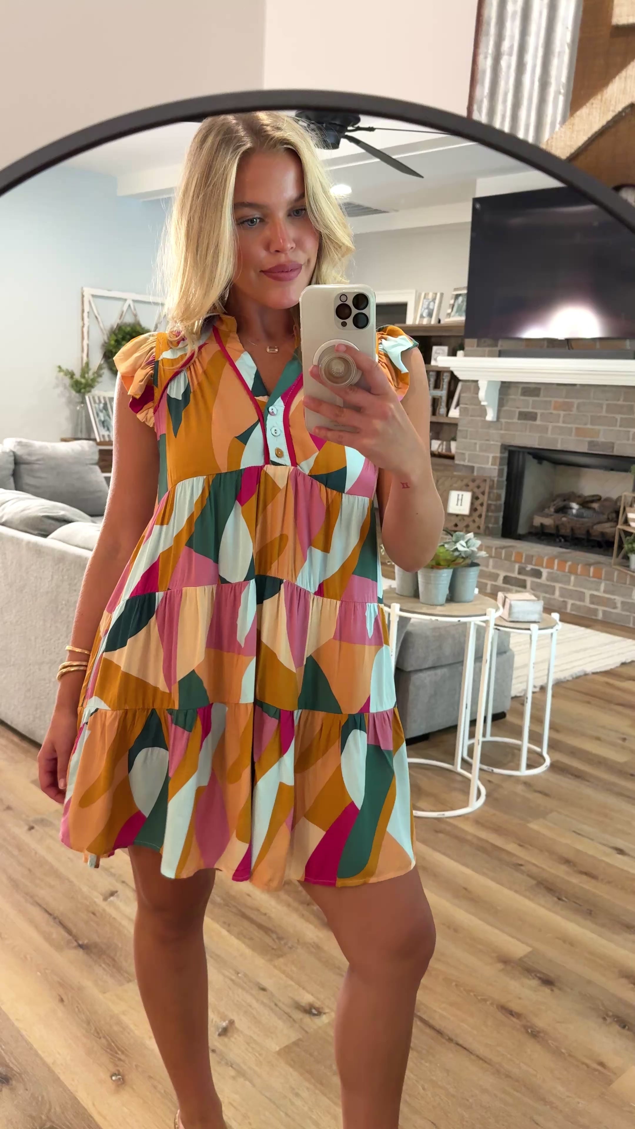 This playful dress features flutter sleeves and a tiered silhouette that adds fun movement with every step. The v-neck and collar bring a touch of chic sophistication, while the abstract print makes it a standout piece for any occasion. Available in sizes S to 2X, it’s perfect for those who love a mix of flirty and fashionable.
