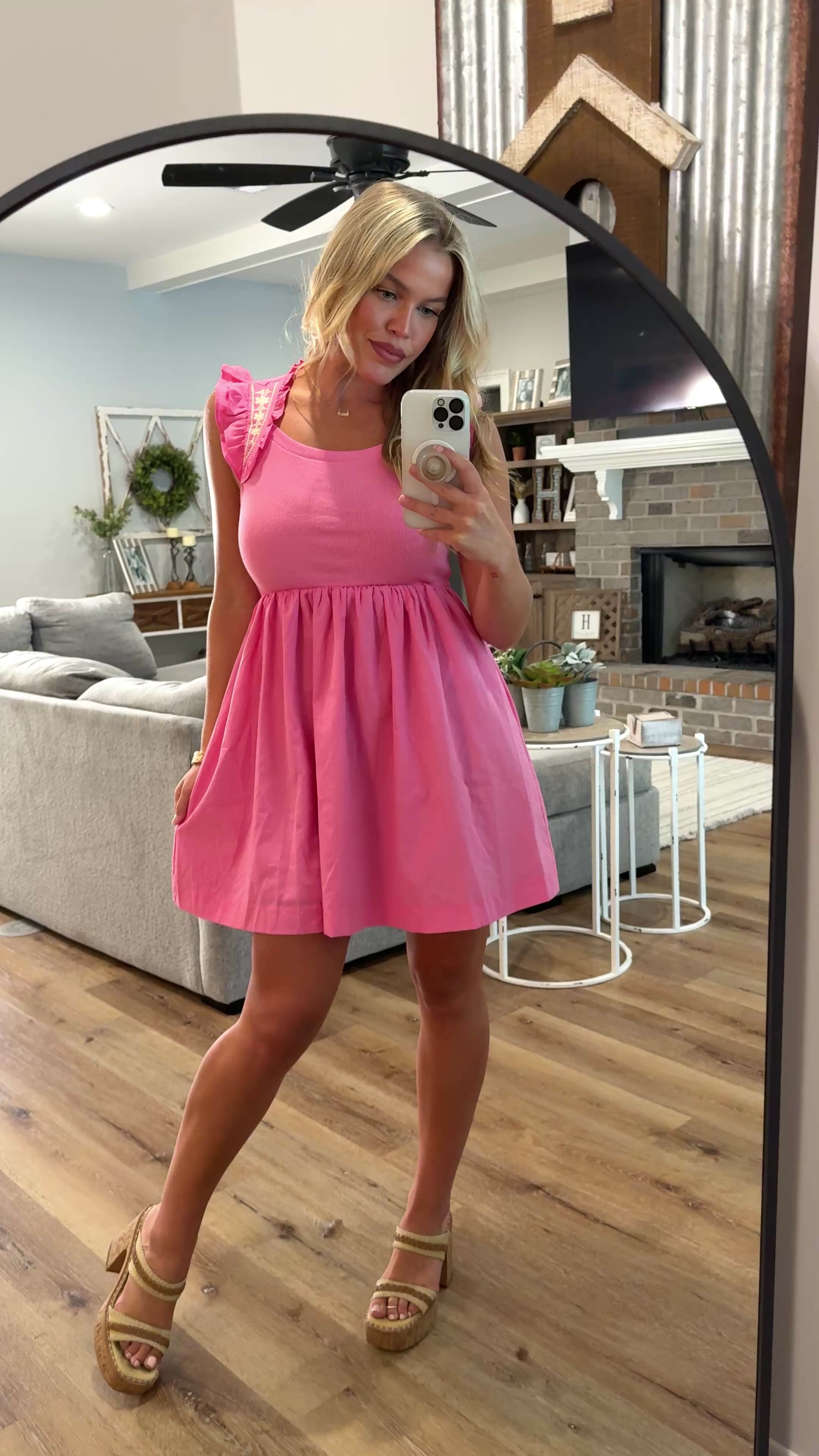 This playful baby doll dress features delicate embroidered ruffle cap sleeves that add a charming touch to its soft pink fabric. The ribbed, stretchy bodice offers a comfy fit while the cotton skirt keeps its shape perfectly. Its light, airy design ensures comfort while keeping you stylish and fun all day long. Perfect for sunny days and casual outings, this dress brings a flirty, feminine vibe to your wardrobe.