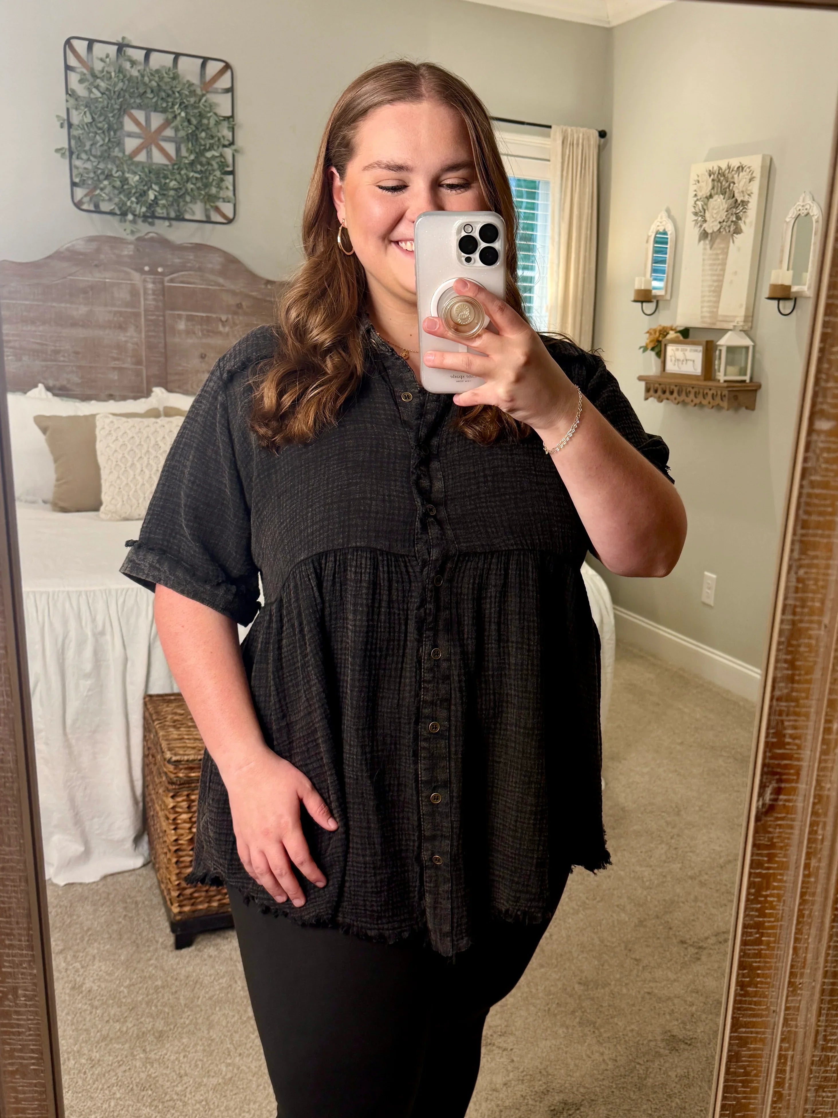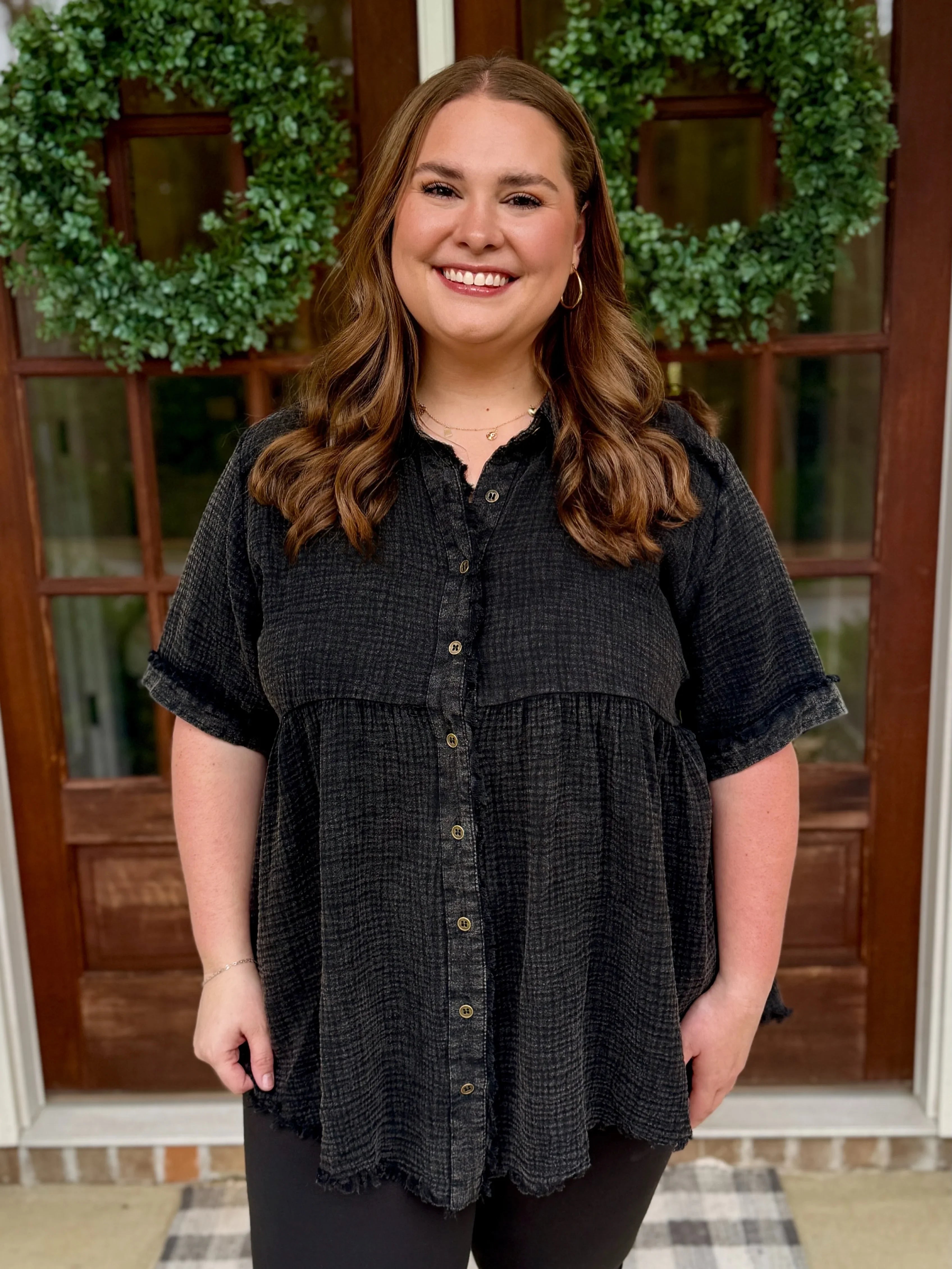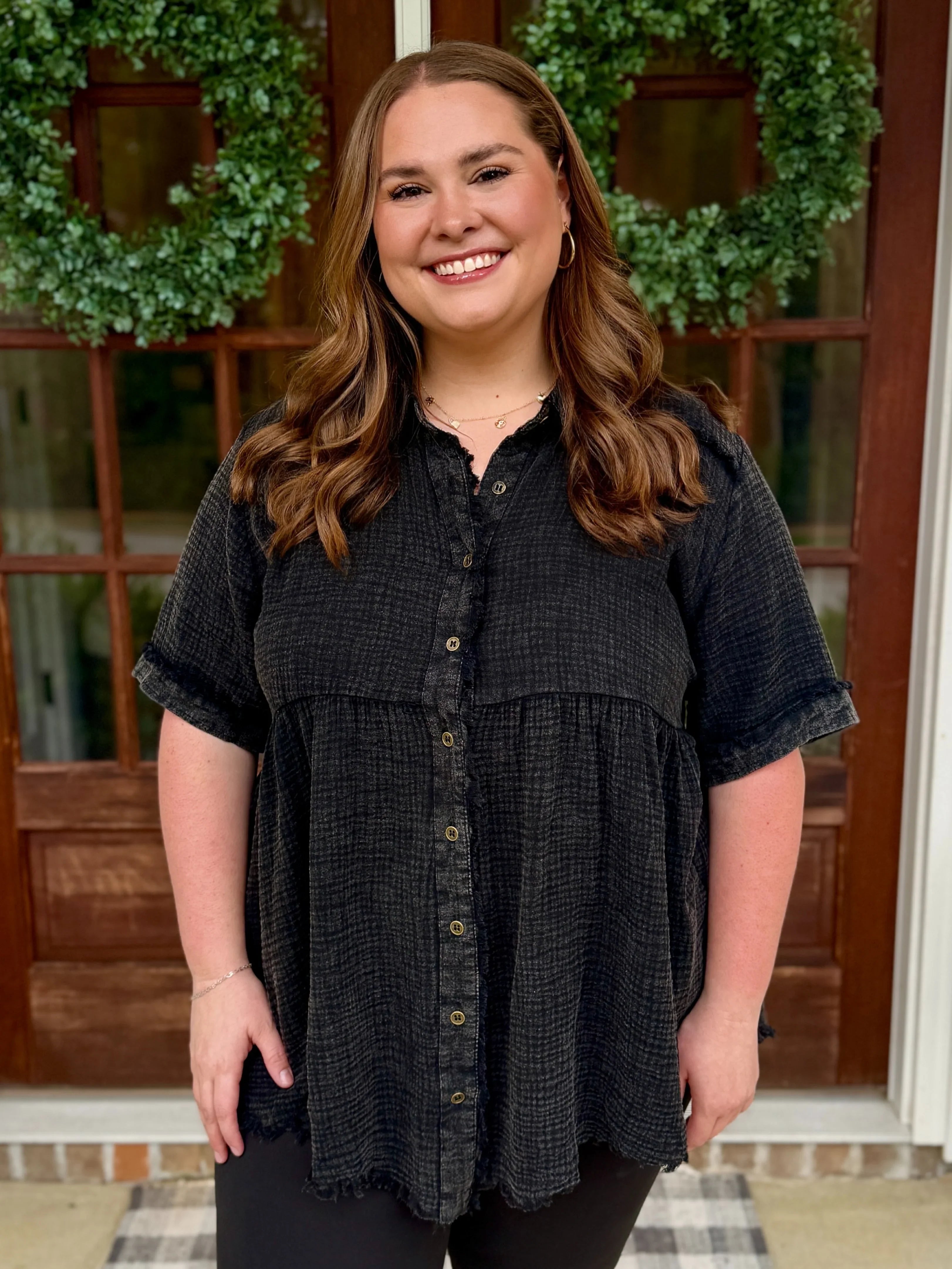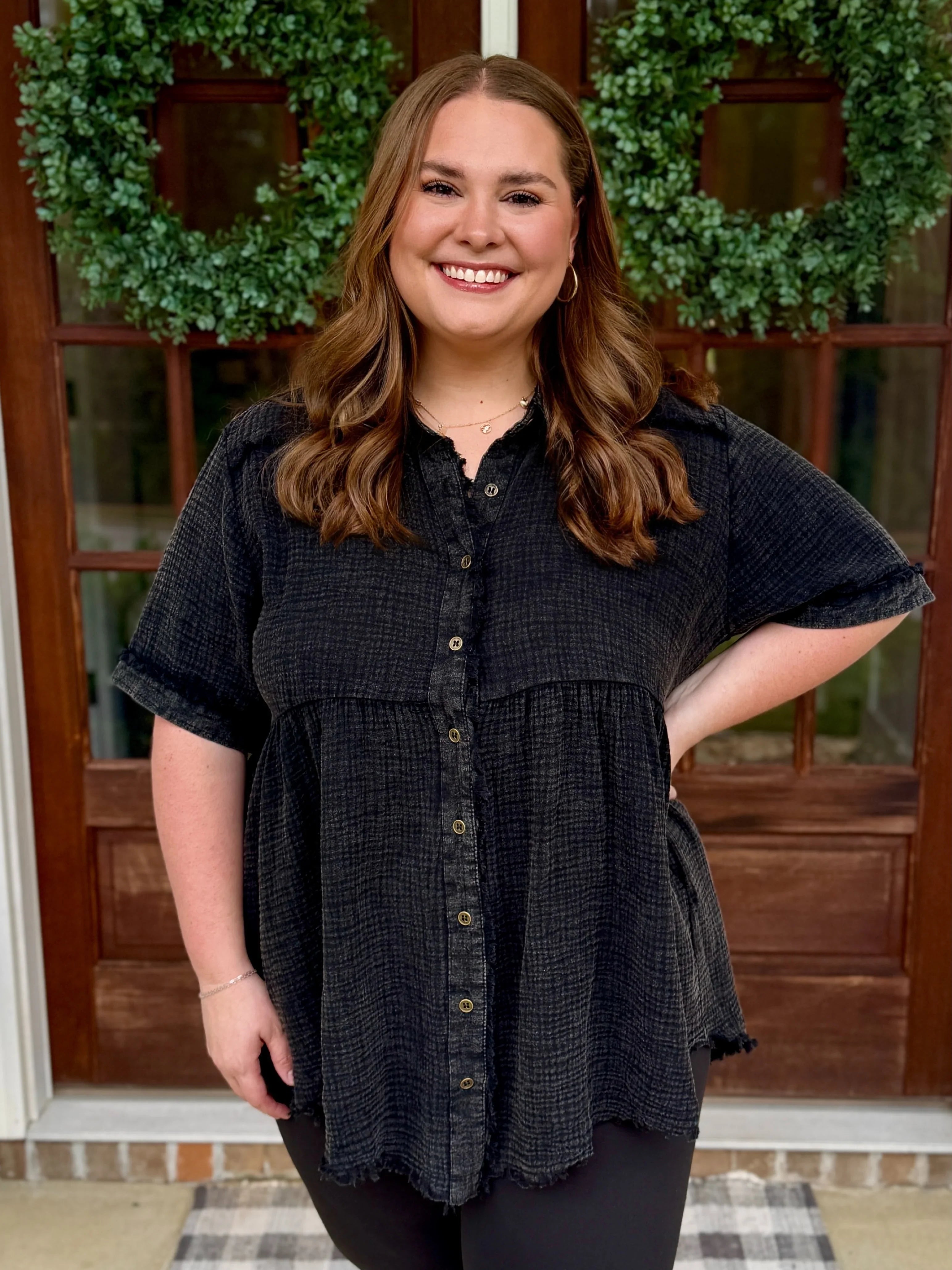 This PAYTON Plus Size Mineral Washed Button Down Top is the perfect blend of comfy and cute. Made from soft gauze material, it feels light and breezy all day. The playful button-up style pairs effortlessly with your favorite leggings or jeans, making it a go-to for casual days or laid-back nights. Add a dash of effortless charm to your wardrobe with this cozy, flattering top!