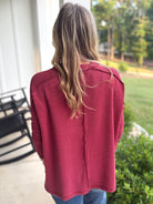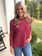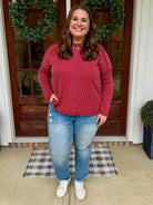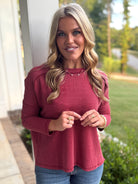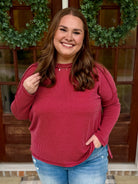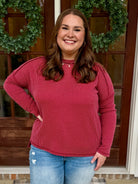 Get cozy in the SAMANTHA Raised Ribbed Top, designed with a chic raw edge boat neck and long sleeves. Its burgundy hue adds a pop of playful color, while the raised rib texture brings a touch of stylish dimension. Perfect for layering or wearing solo, this top hugs comfortably from S to 3X for a flattering fit that’s ready for anything.