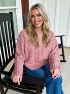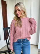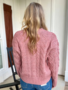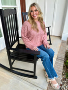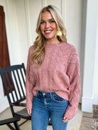 Stay cozy and stylish in this mauve cable sweater, featuring a warm, trendy cable-knit pattern that adds texture and charm. Perfect for layering on chilly days or making a statement at casual outings, it combines comfort with playful fashion flair.