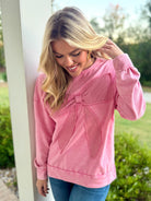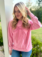 Embrace cozy charm with the MAGGIE Pink Bow Sweatshirt Top. Featuring a playful textured bow front, this sweatshirt adds a sweet and stylish twist to your casual look. Perfect for lounging or outings, its soft fabric and flattering fit make comfort utterly fun. Brighten your wardrobe with this delightful blend of comfy and cute!