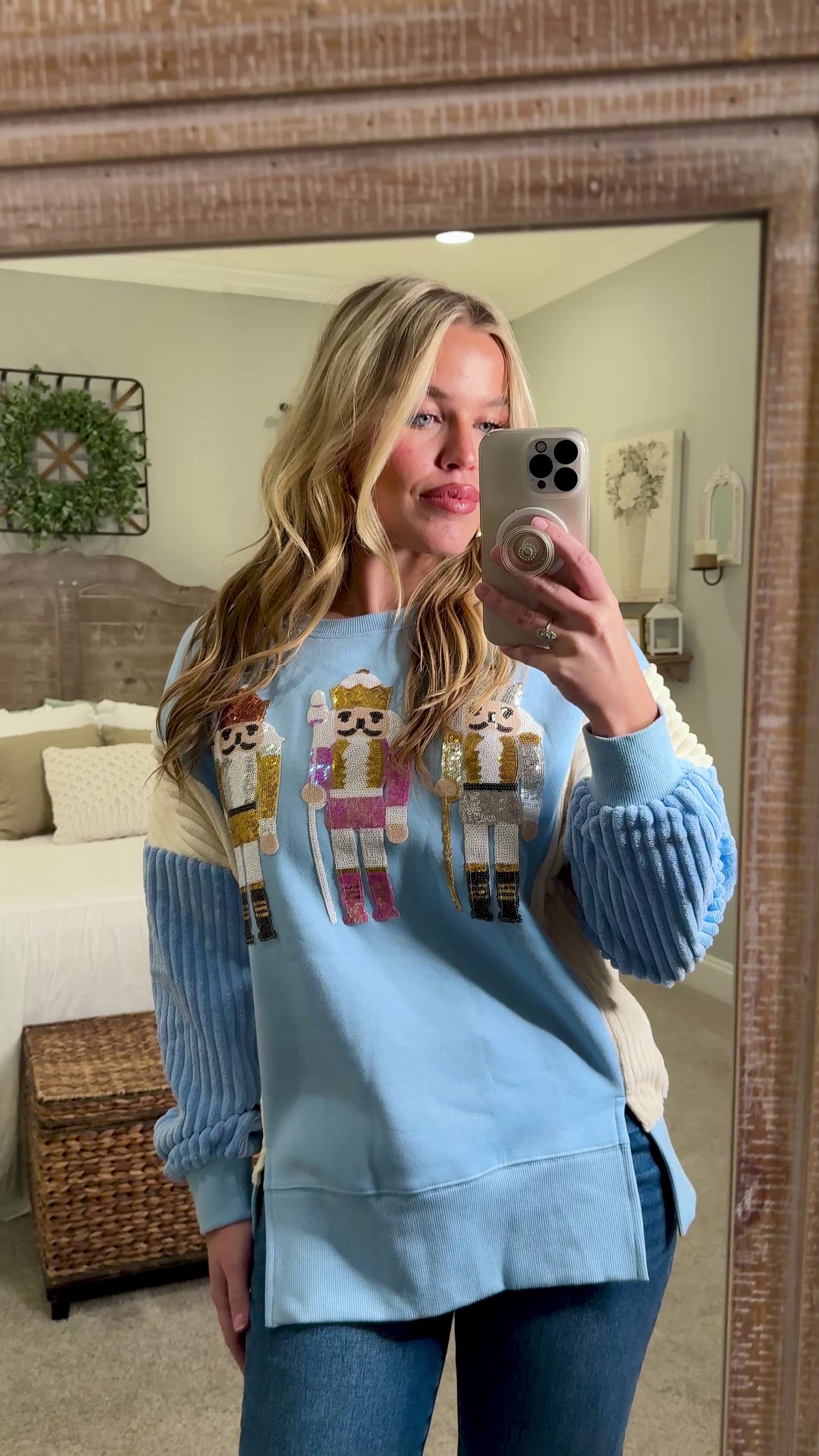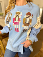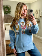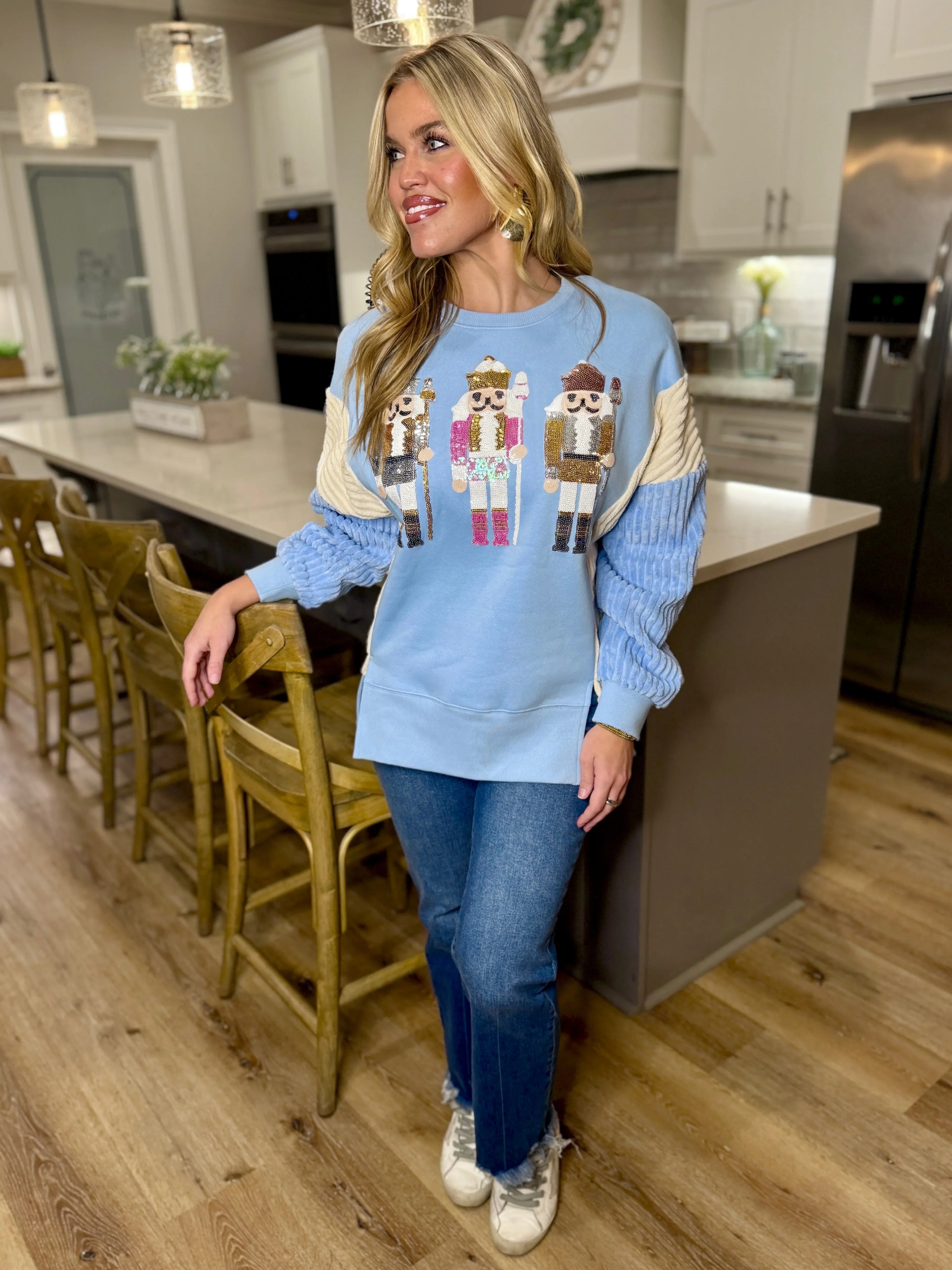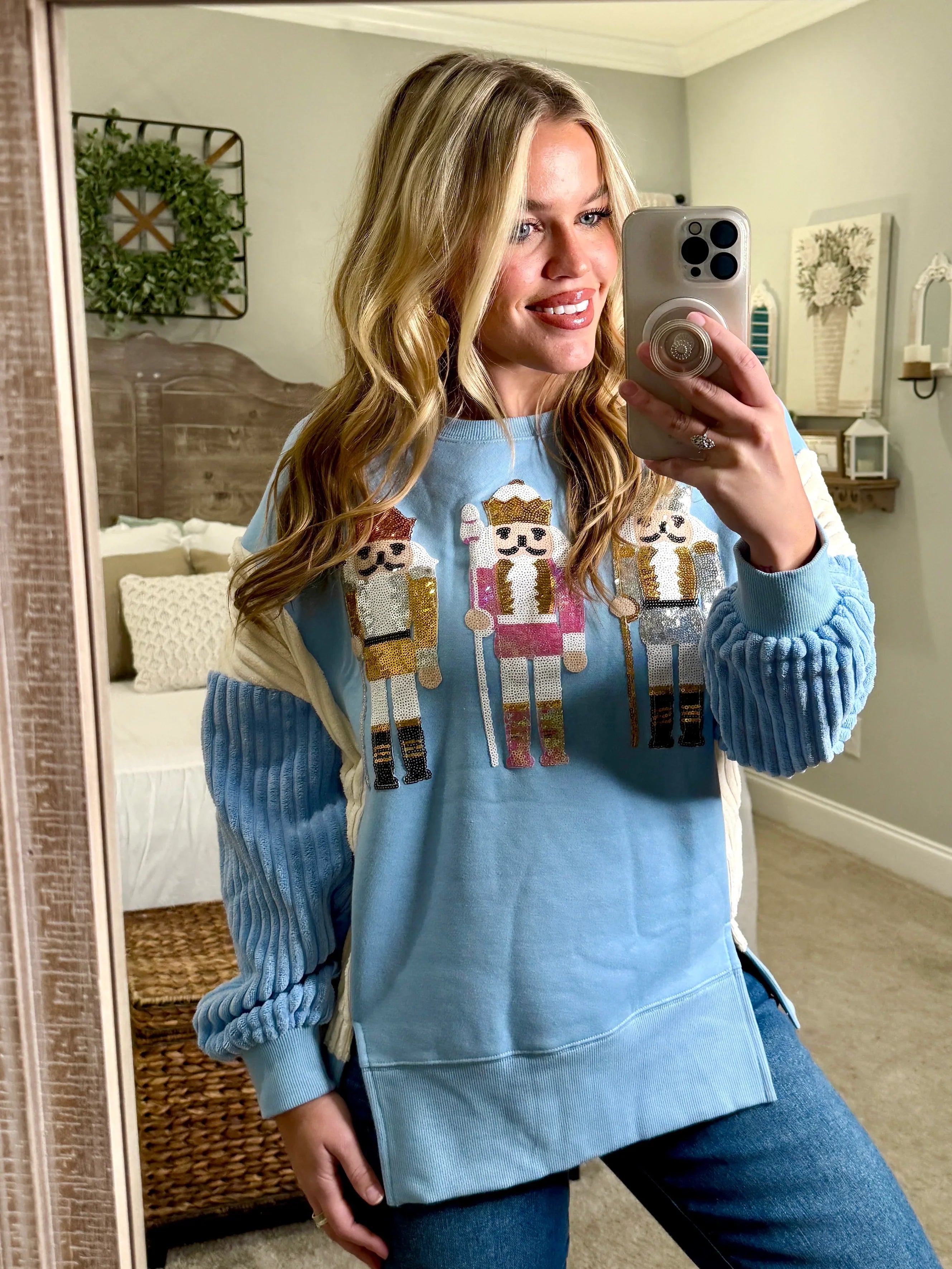 Get ready to sparkle and shine with this playful Nutcracker Sequin Sweatshirt! Featuring eye-catching sequin detailing that brings festive flair, this cozy piece combines the best of comfort and style. Soft chenille sleeves provide a luxurious feel against your skin, while convenient side slits add movement and a modern edge. Perfect for holiday gatherings or casual seasonal wear, this sweatshirt lets you celebrate in style without sacrificing comfort.