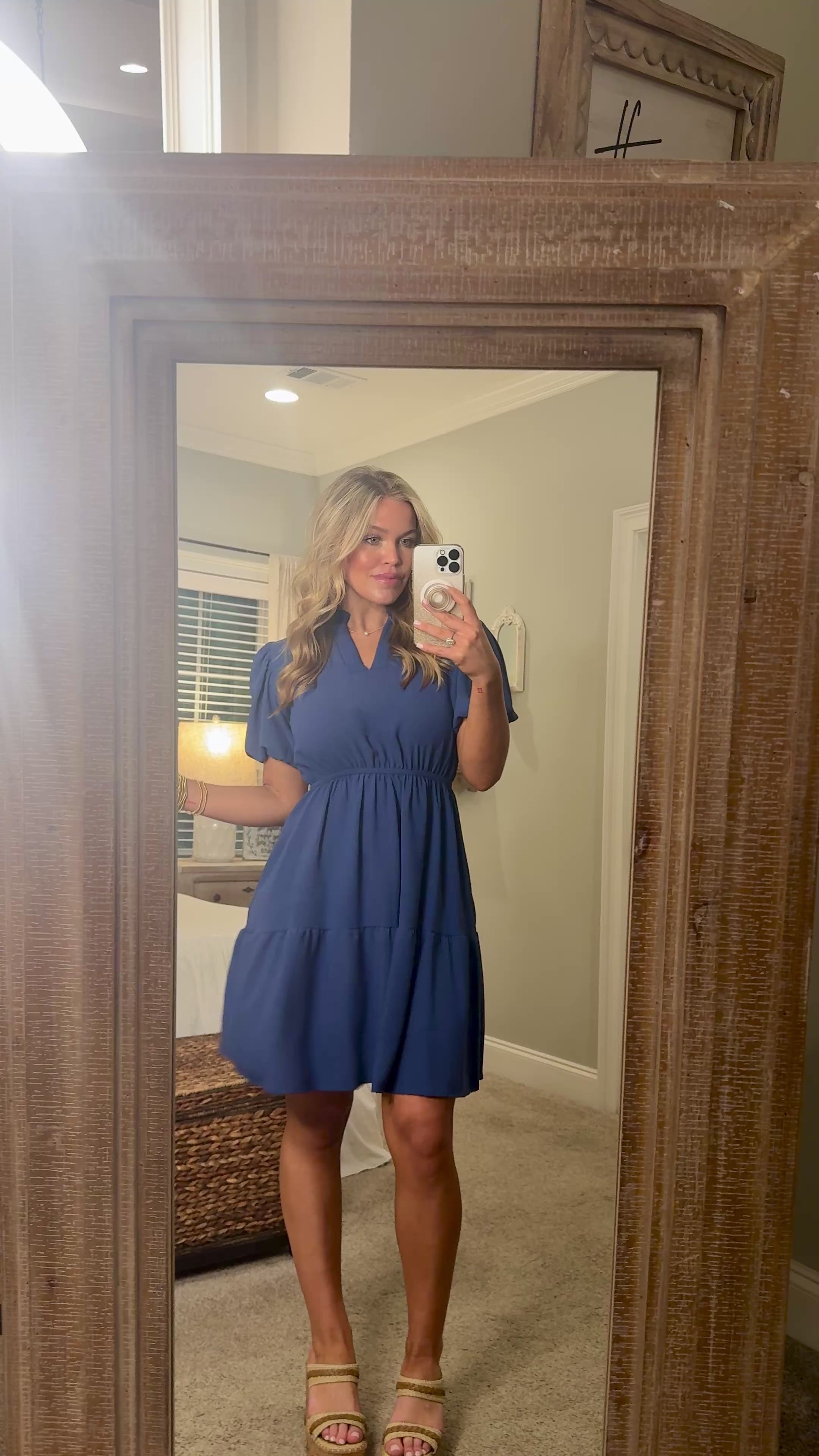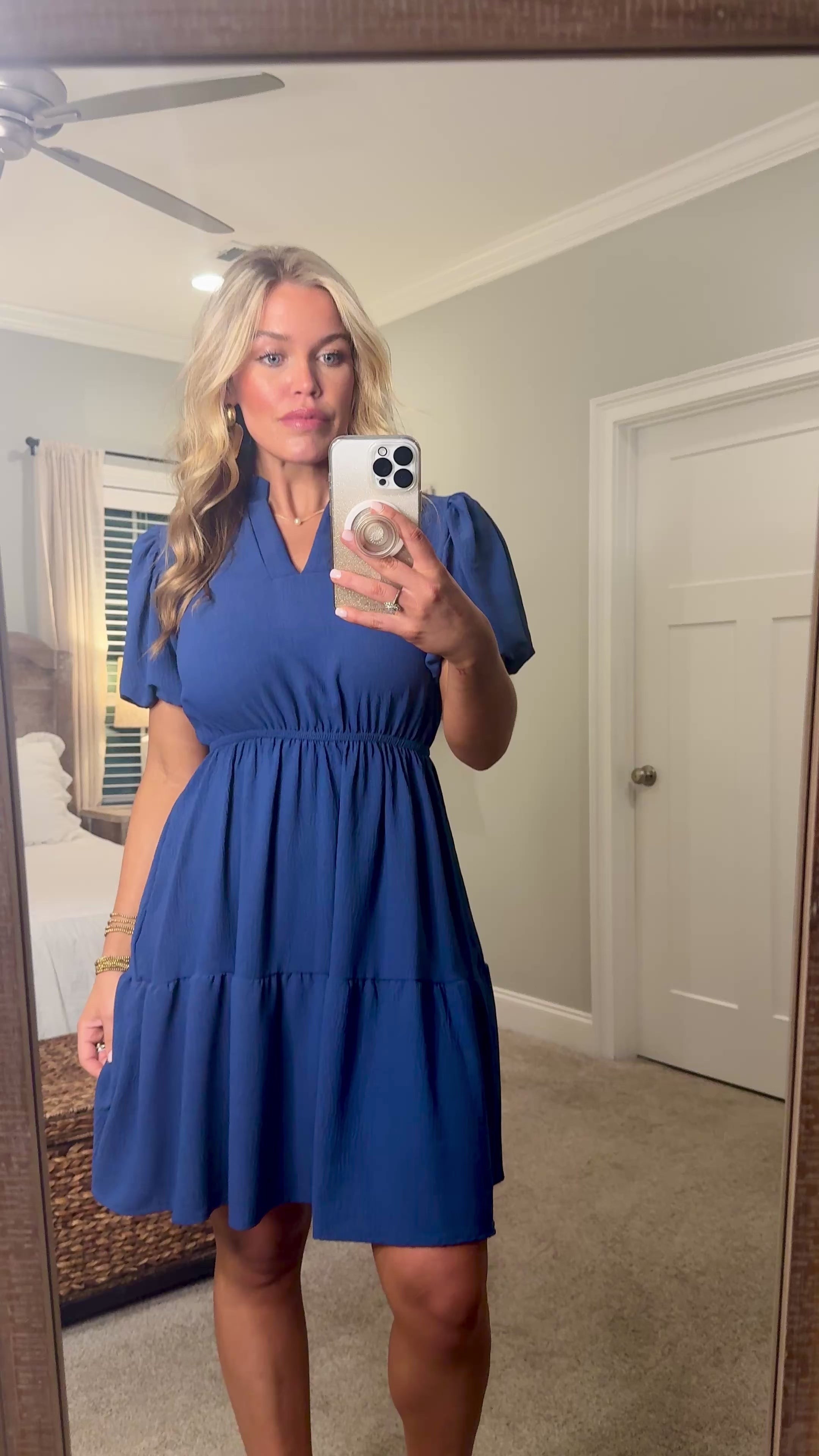 Solid tiered dress Ruffled neckline V neck placket Puff short bubble sleeve Pockets Elastic around waistline Tiered skirt Air flow fabric Size S HPS Length is 36"