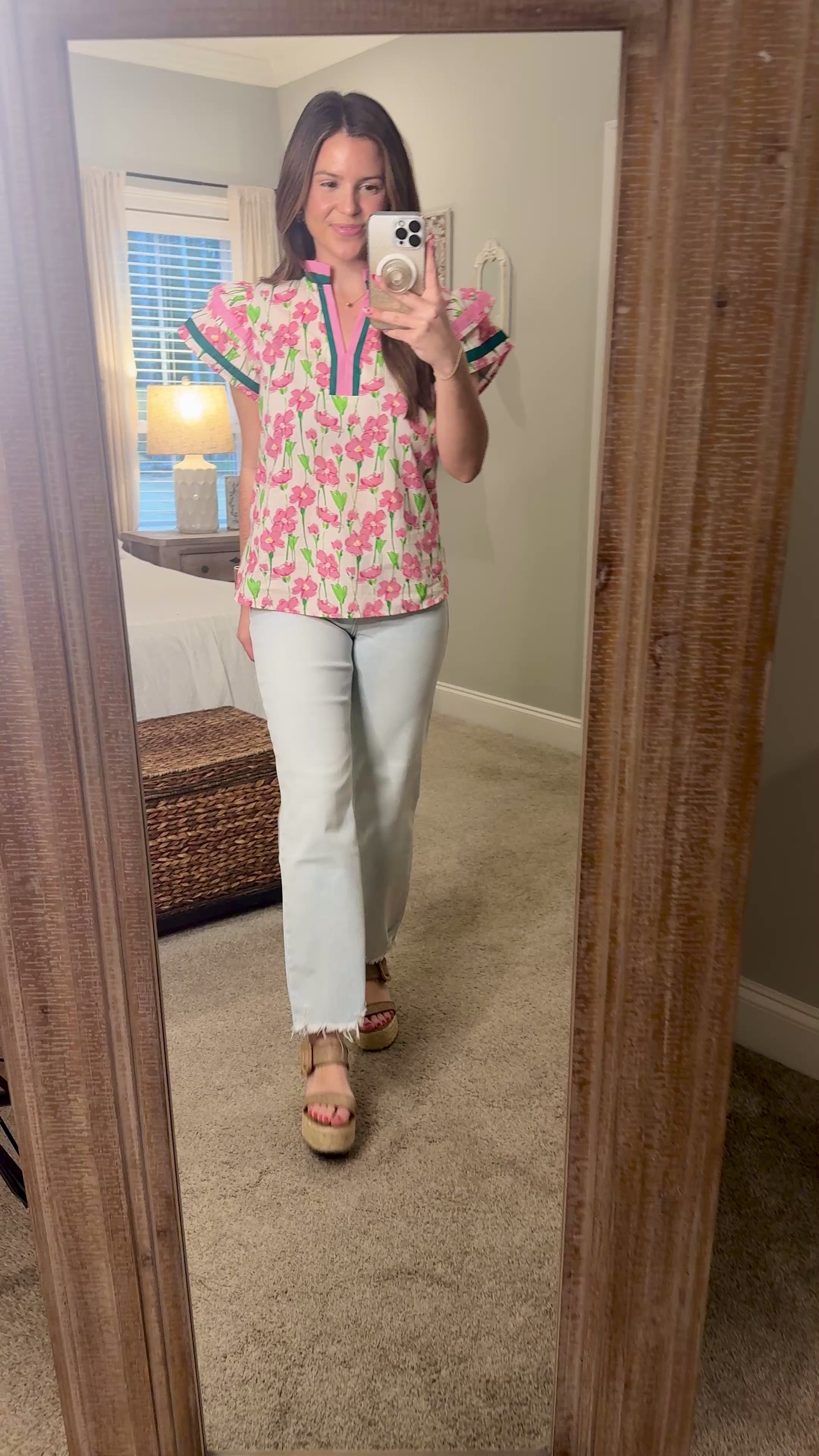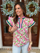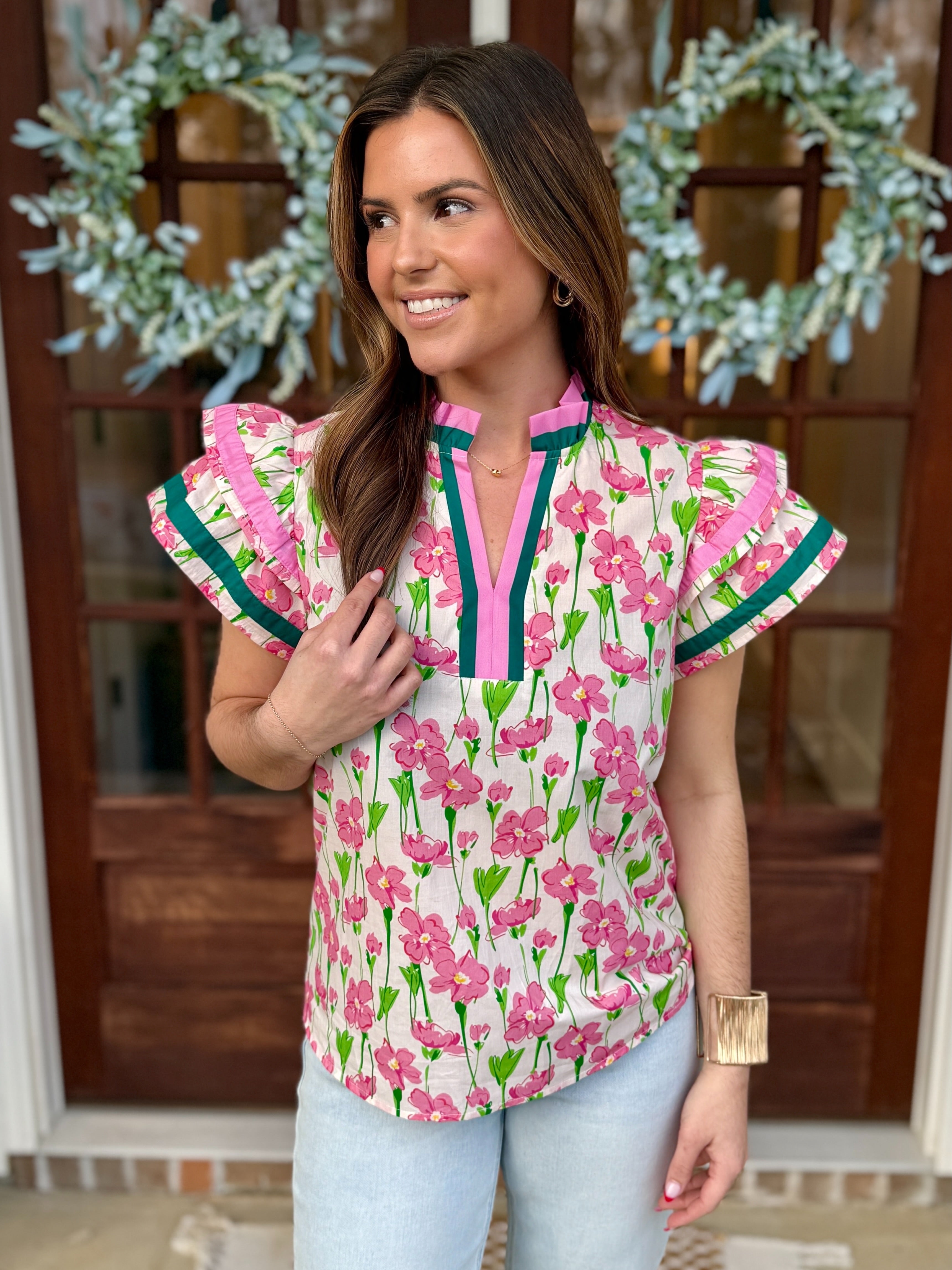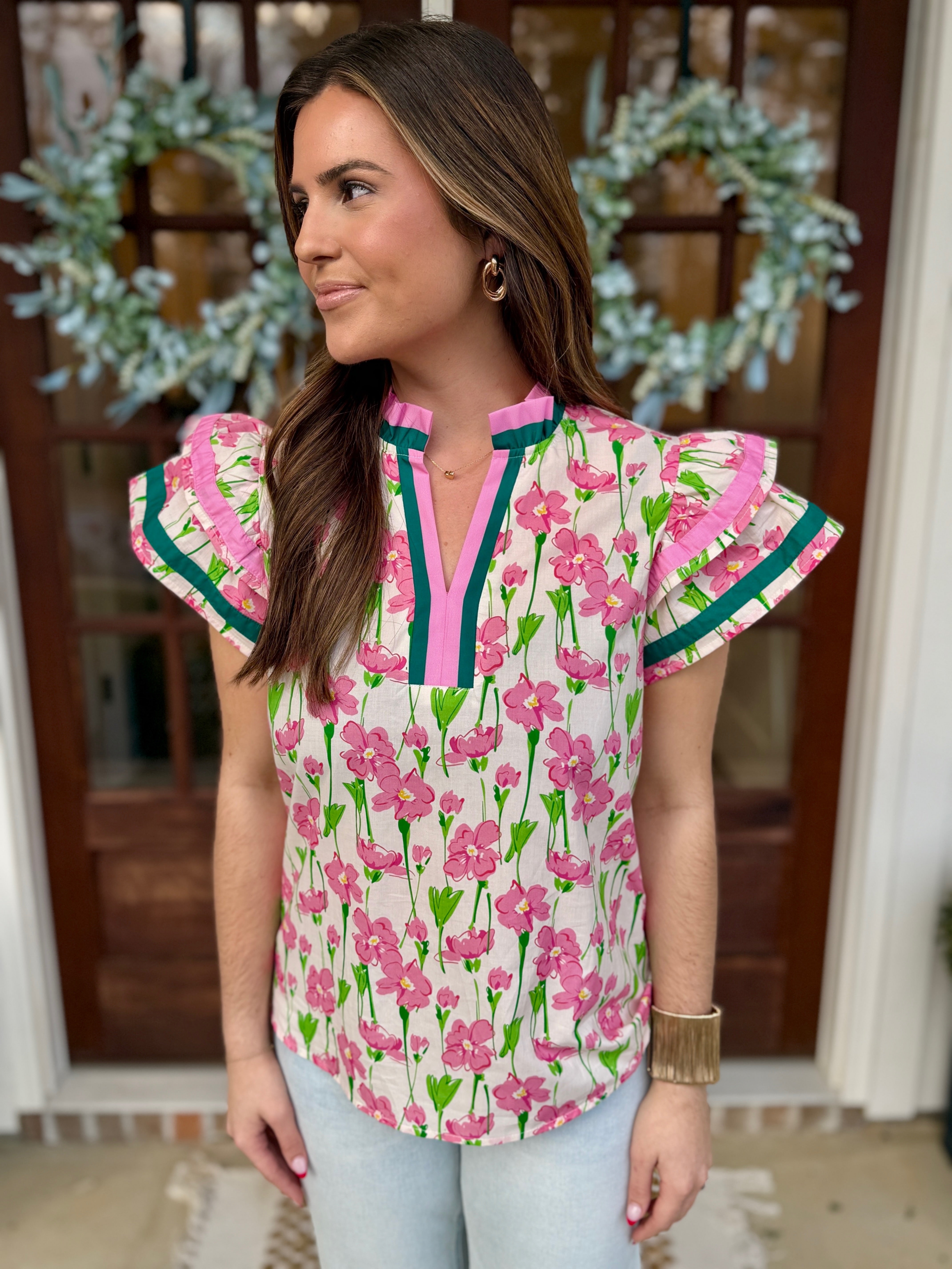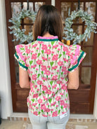 ABIGAIL Pink/Green Floral Ruffle Neck Top