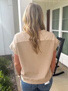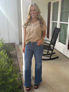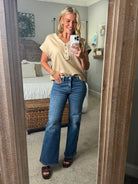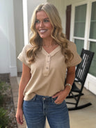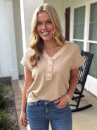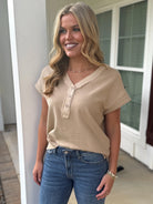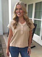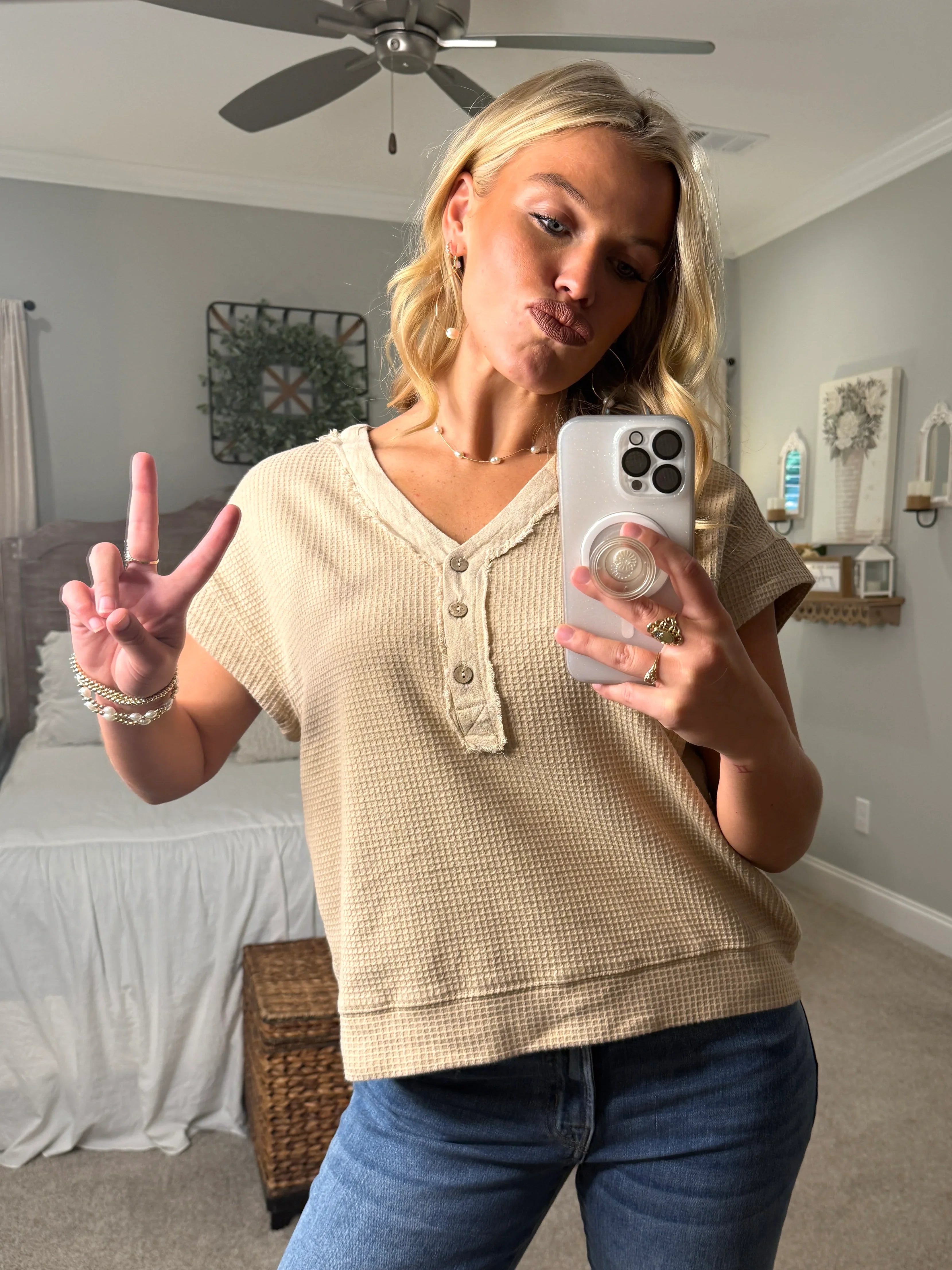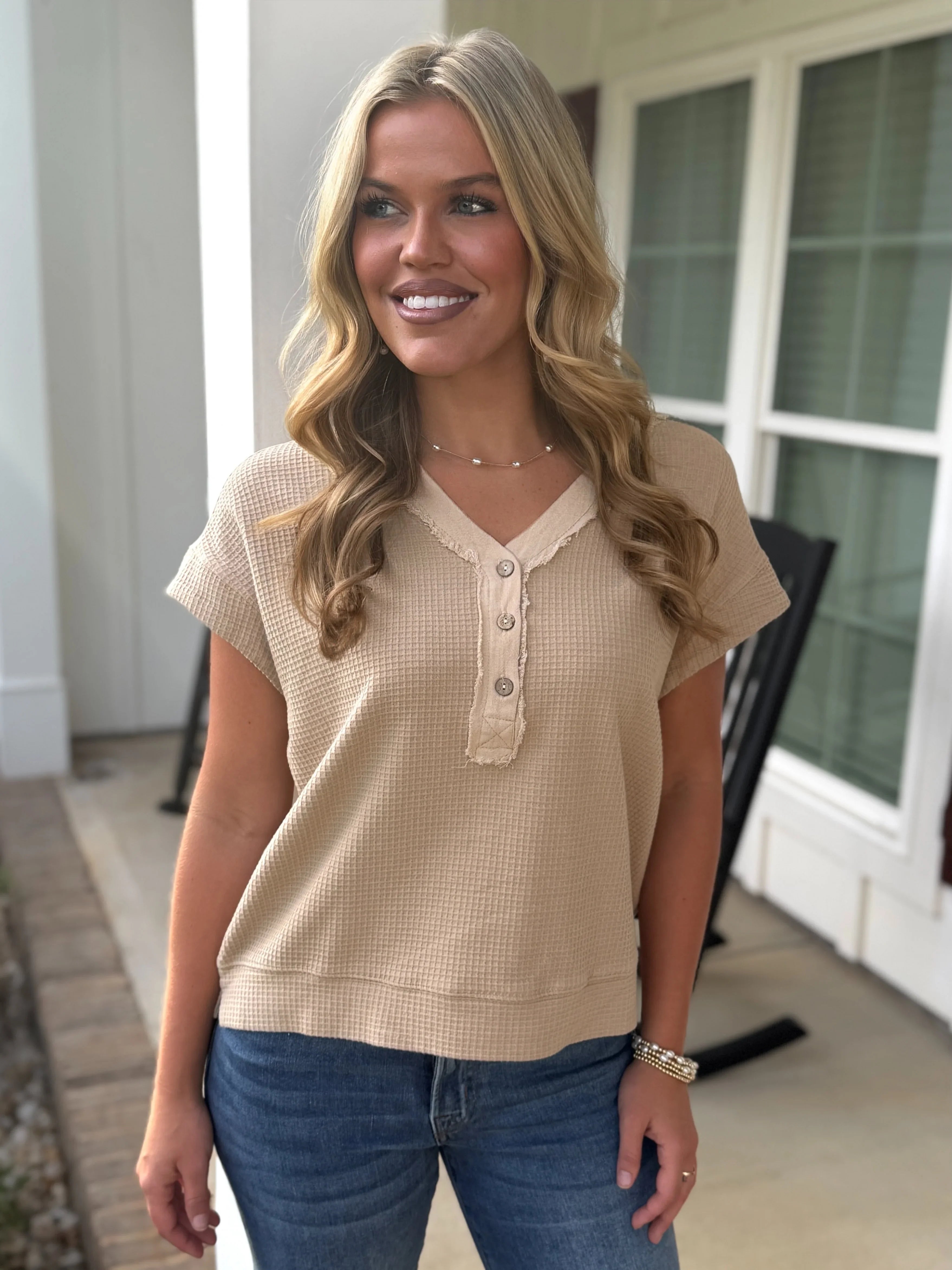 Cozy up in the DEMI Distressed Waffle Top in Tan, featuring a soft waffle-knit fabric that feels as good as it looks. The playful addition of cute buttons adds a charming touch, making this top perfect for casual days or layering up with flair. Enjoy comfort with a hint of sass!