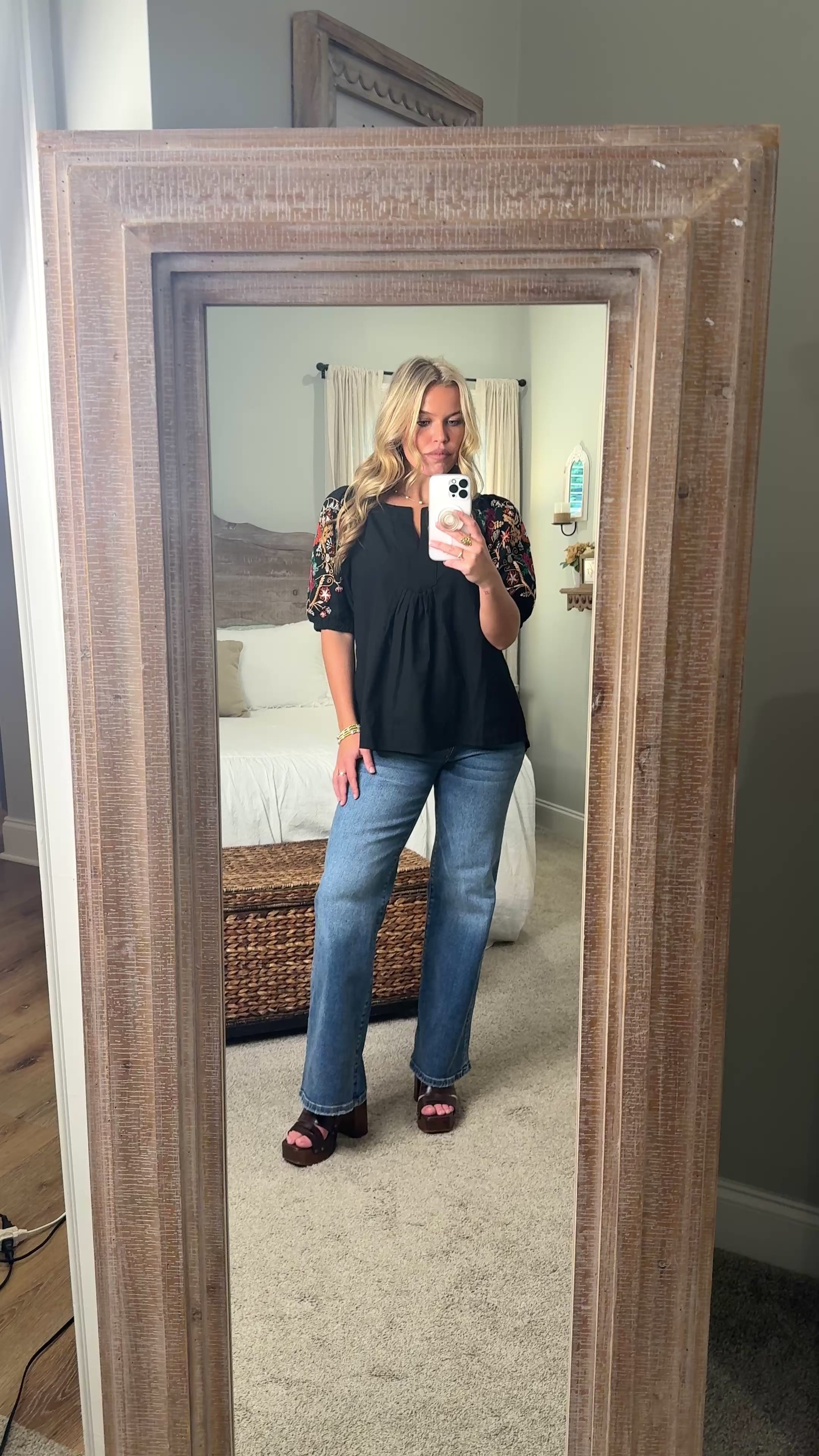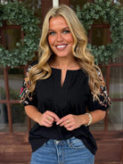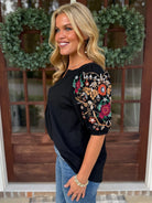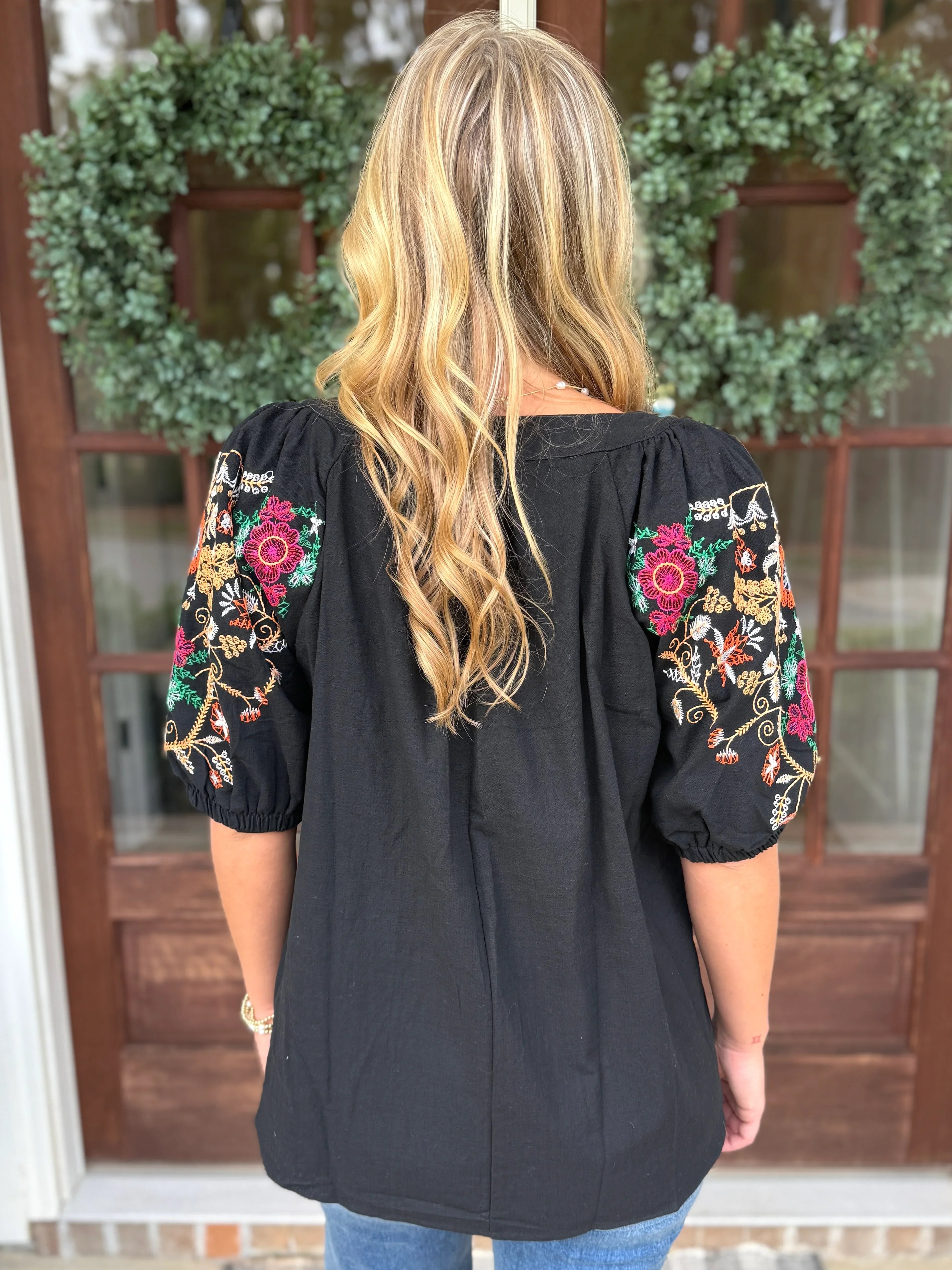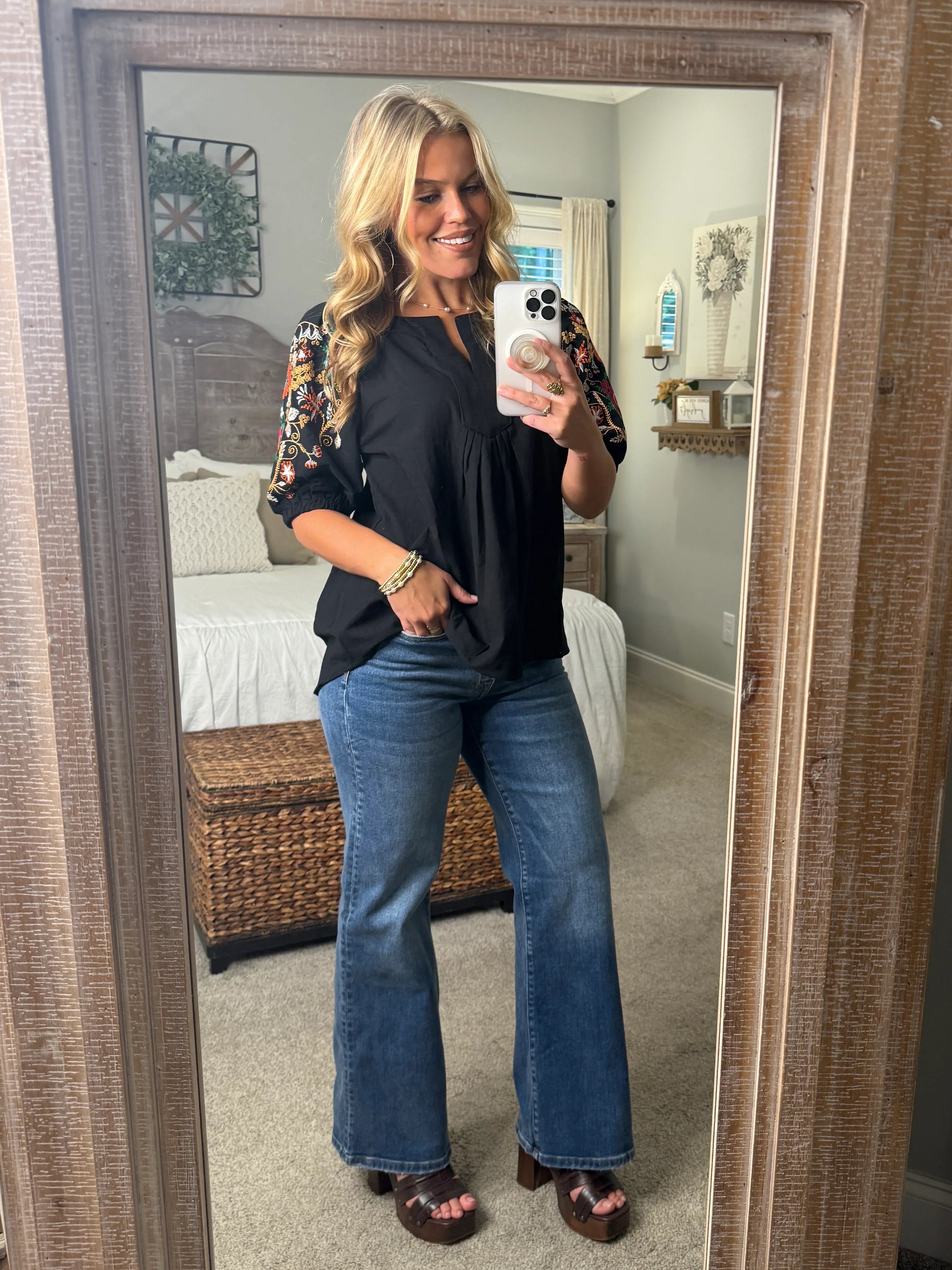 This playful black top features charming embroidered floral sleeves that add a touch of whimsy to any outfit. With a cute v-cut neckline, it’s flattering and fun, perfect whether you tuck it in for a polished look or leave it out for relaxed vibes. A versatile favorite for your wardrobe!