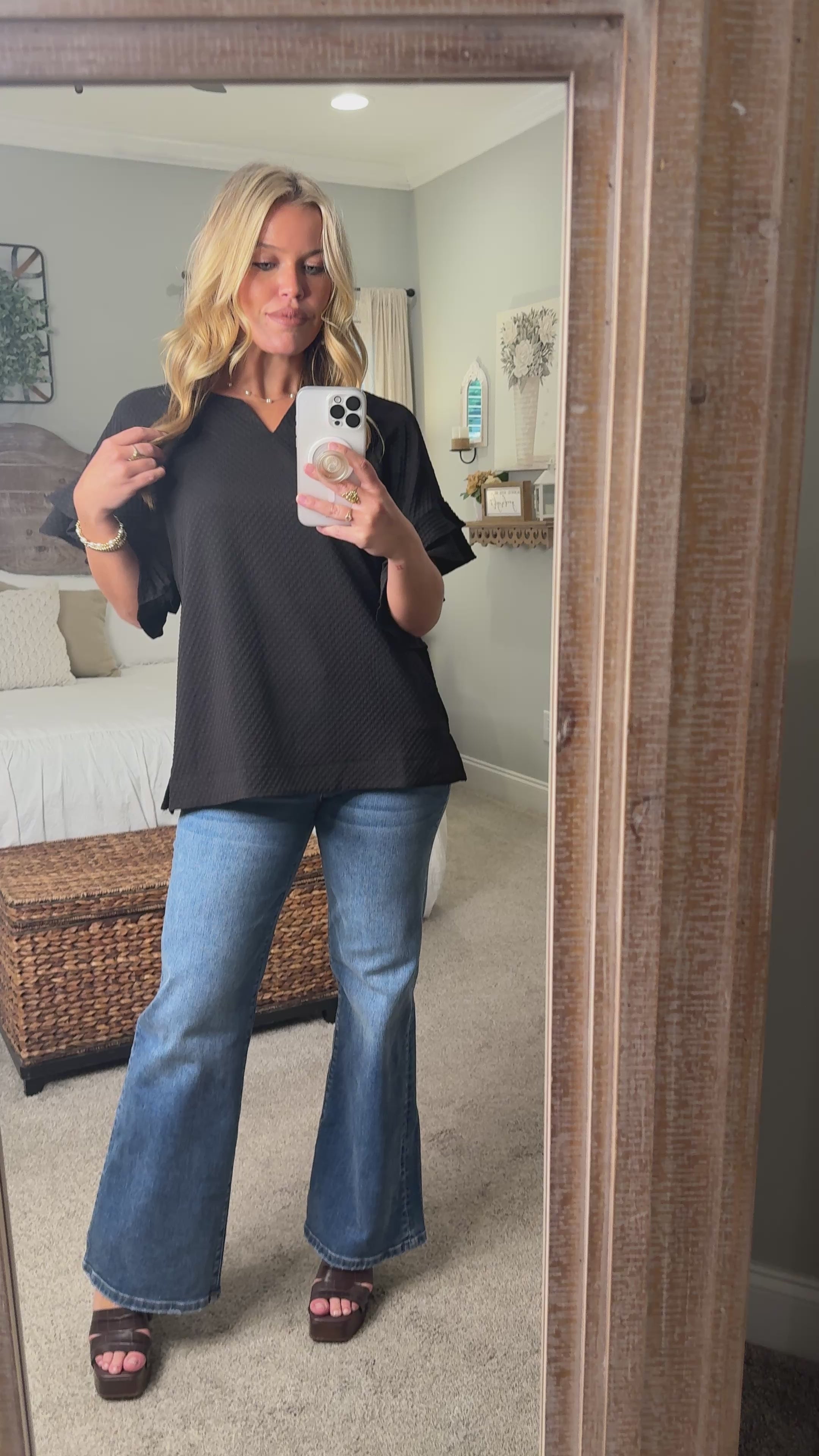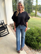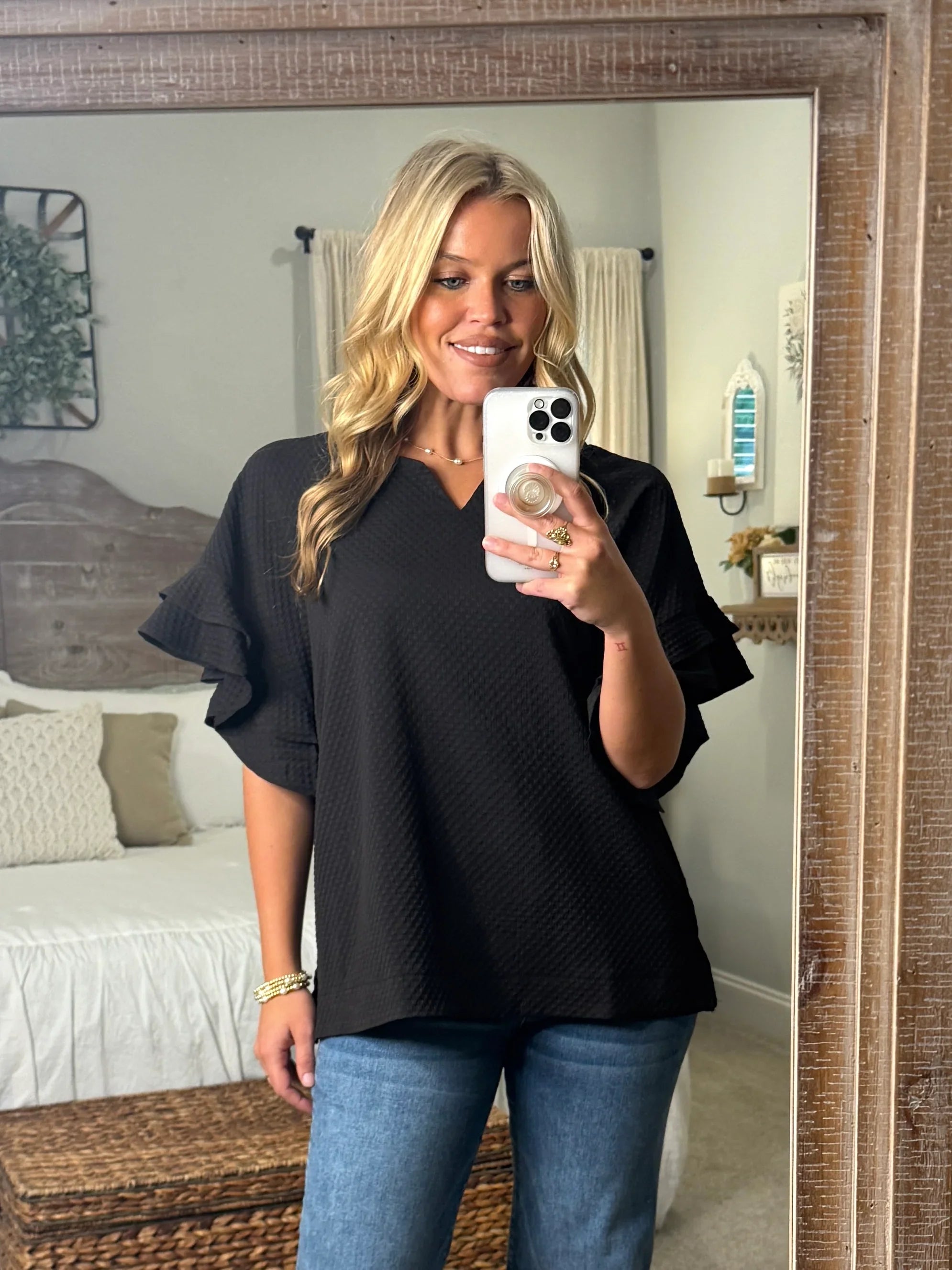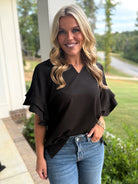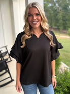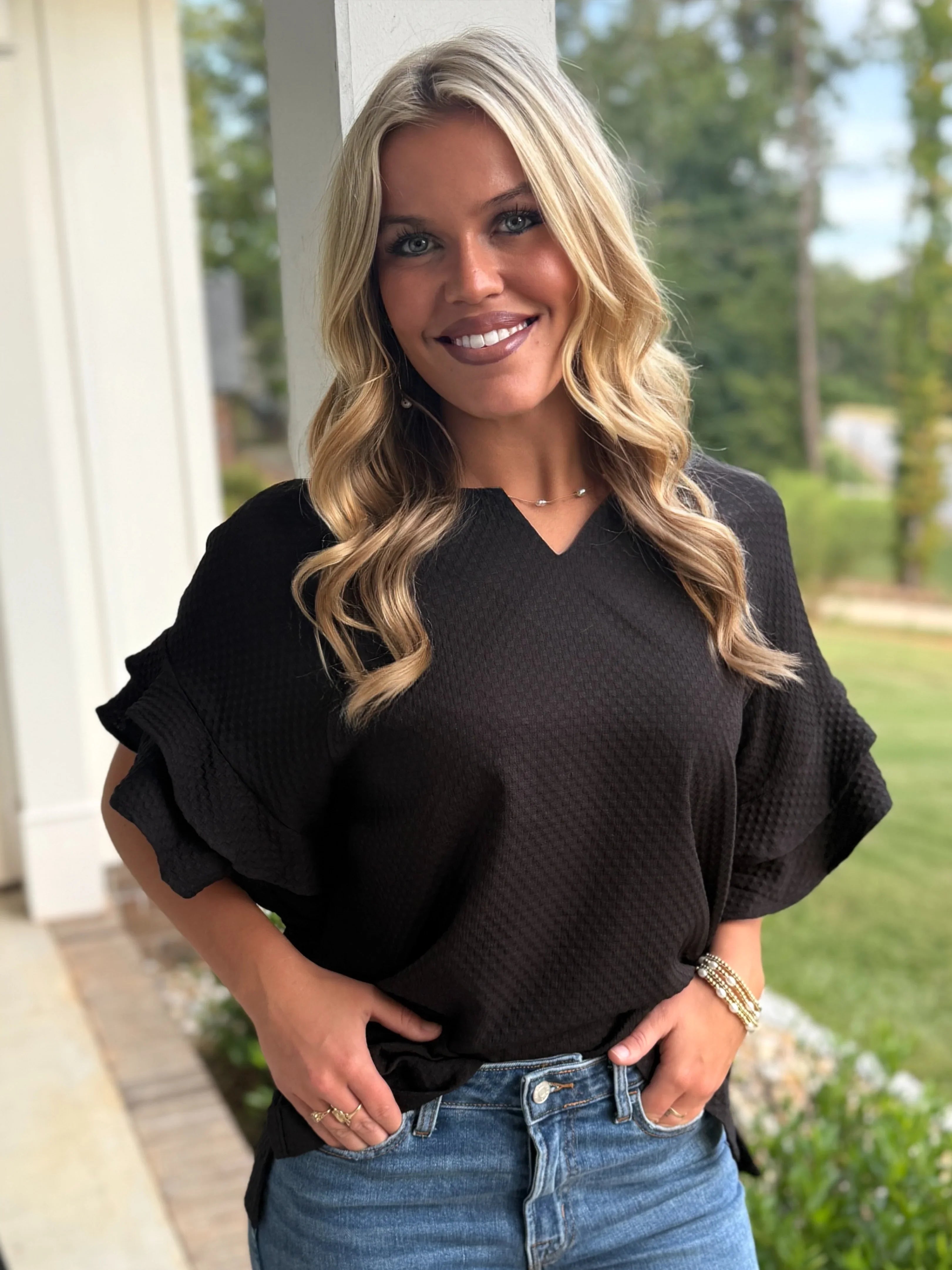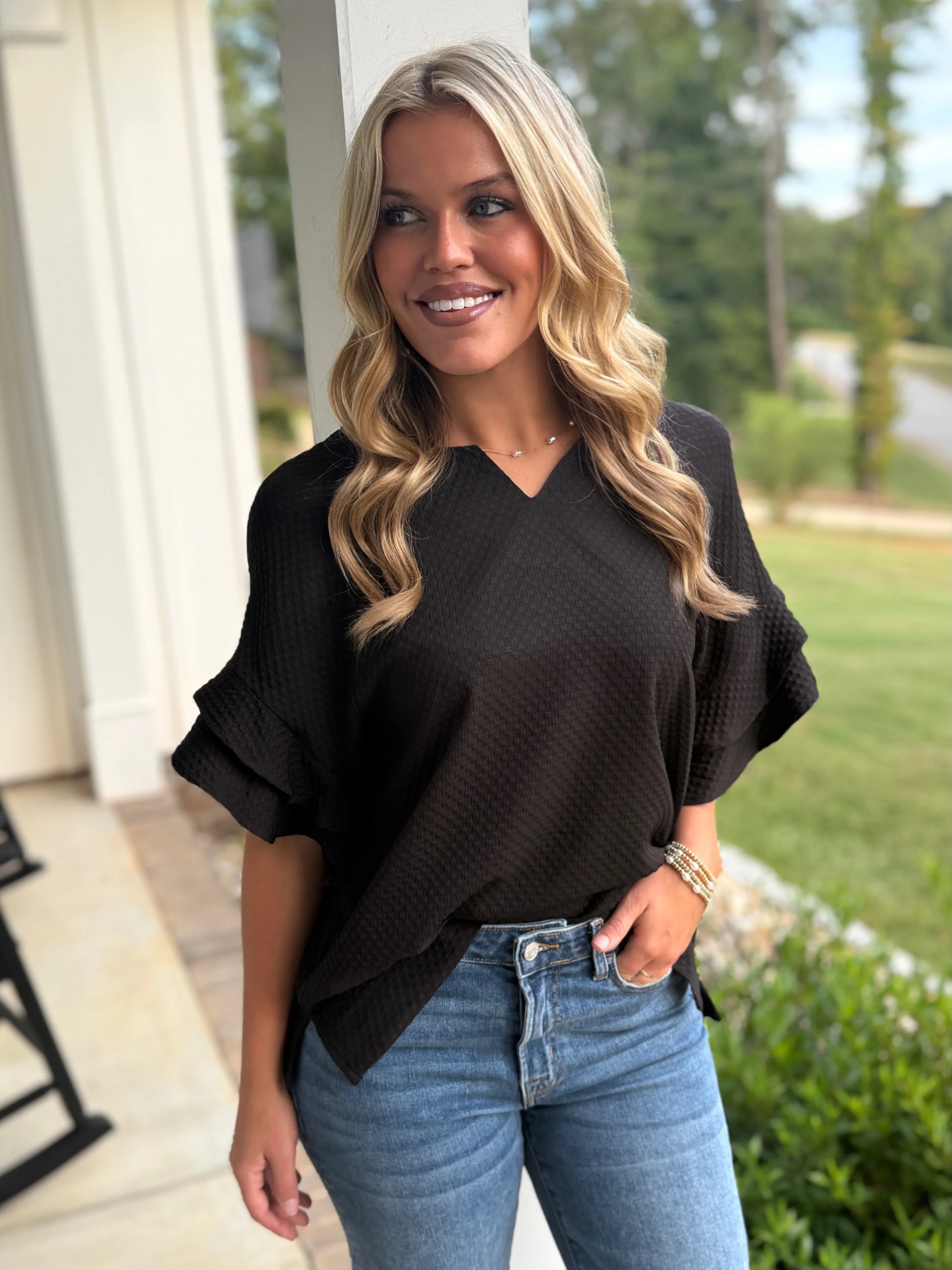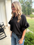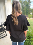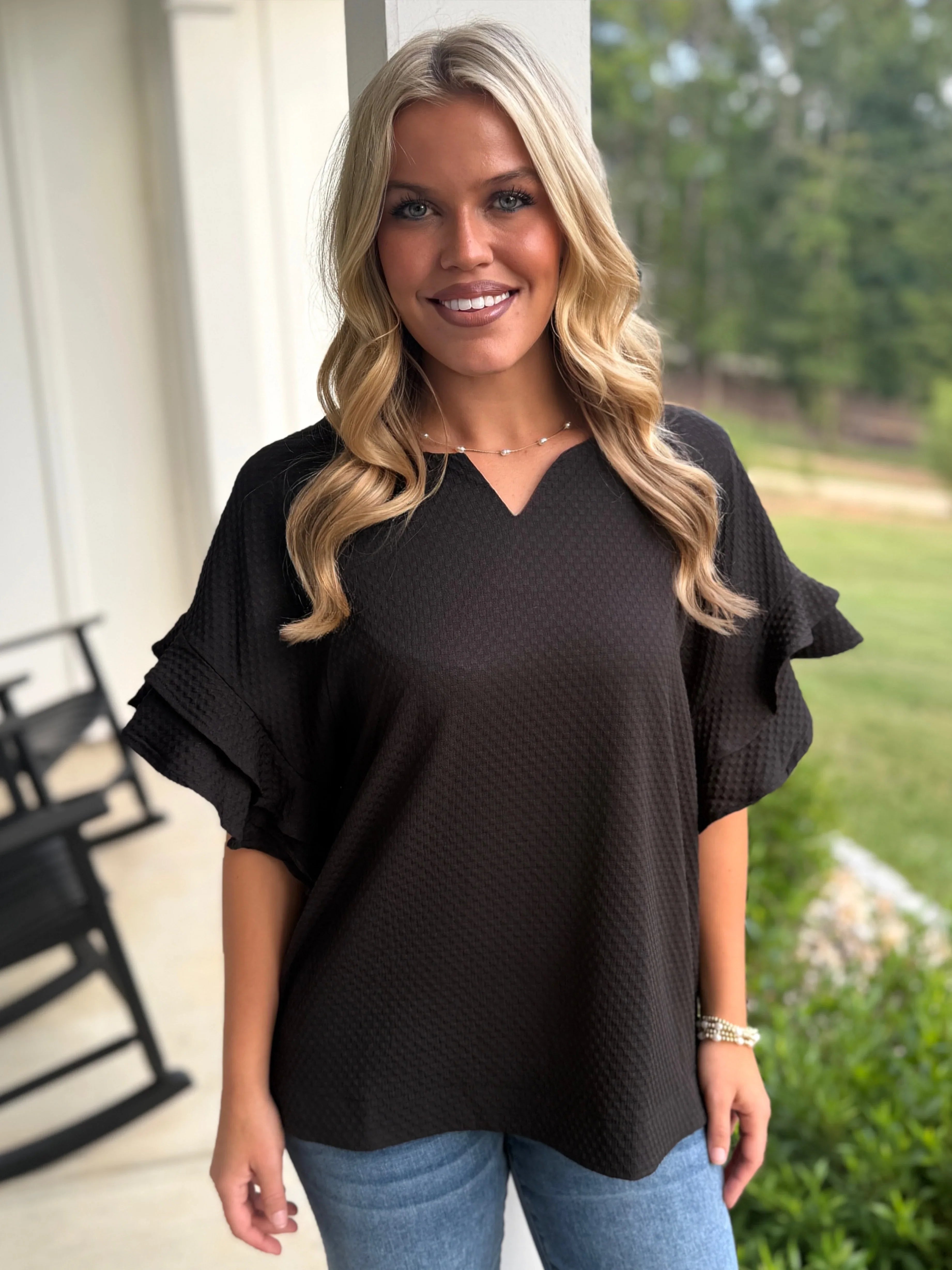 ALORA Jacquard Textured Ruffle Top (Black)