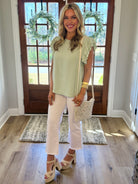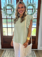 Elevate your wardrobe with the KENNEDY Simple Ruffle Top in Sage. Crafted from silky, wrinkle-free fabric, this top effortlessly blends style and comfort. Its delicate ruffle detail adds a touch of femininity, making it perfect for any occasion. Embrace confidence and elegance in every wear!