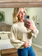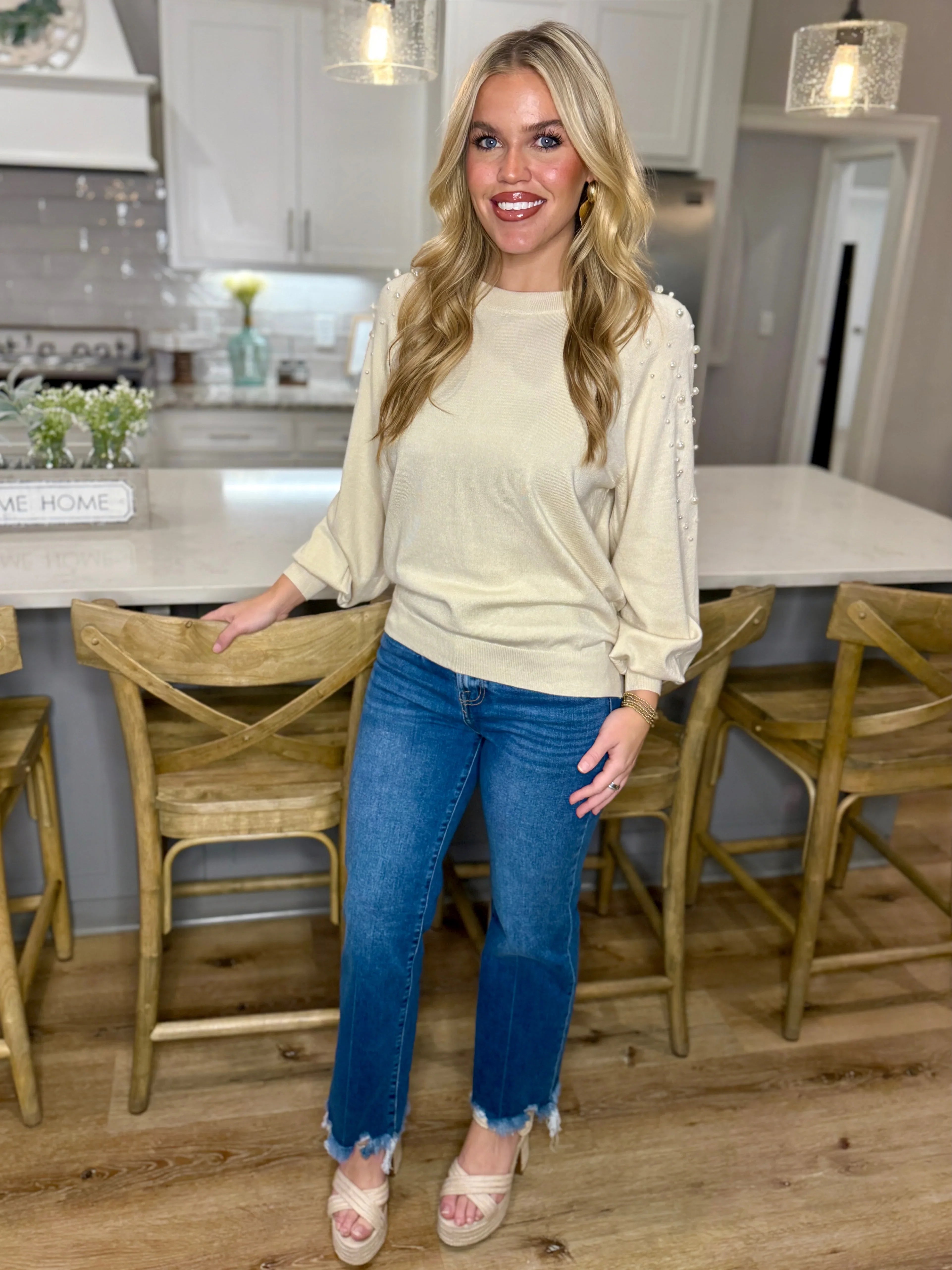 Elevate your everyday style with this delicate cream pullover that whispers sophistication. Crafted from feather-light, breathable fabric, it's the perfect layering piece for transitional weather. The real showstopper? Gorgeous pearl details adorning the sleeves that catch the light with every move. Effortlessly chic and undeniably charming, this sweater proves that sometimes the sweetest touches make the biggest impact.
