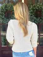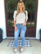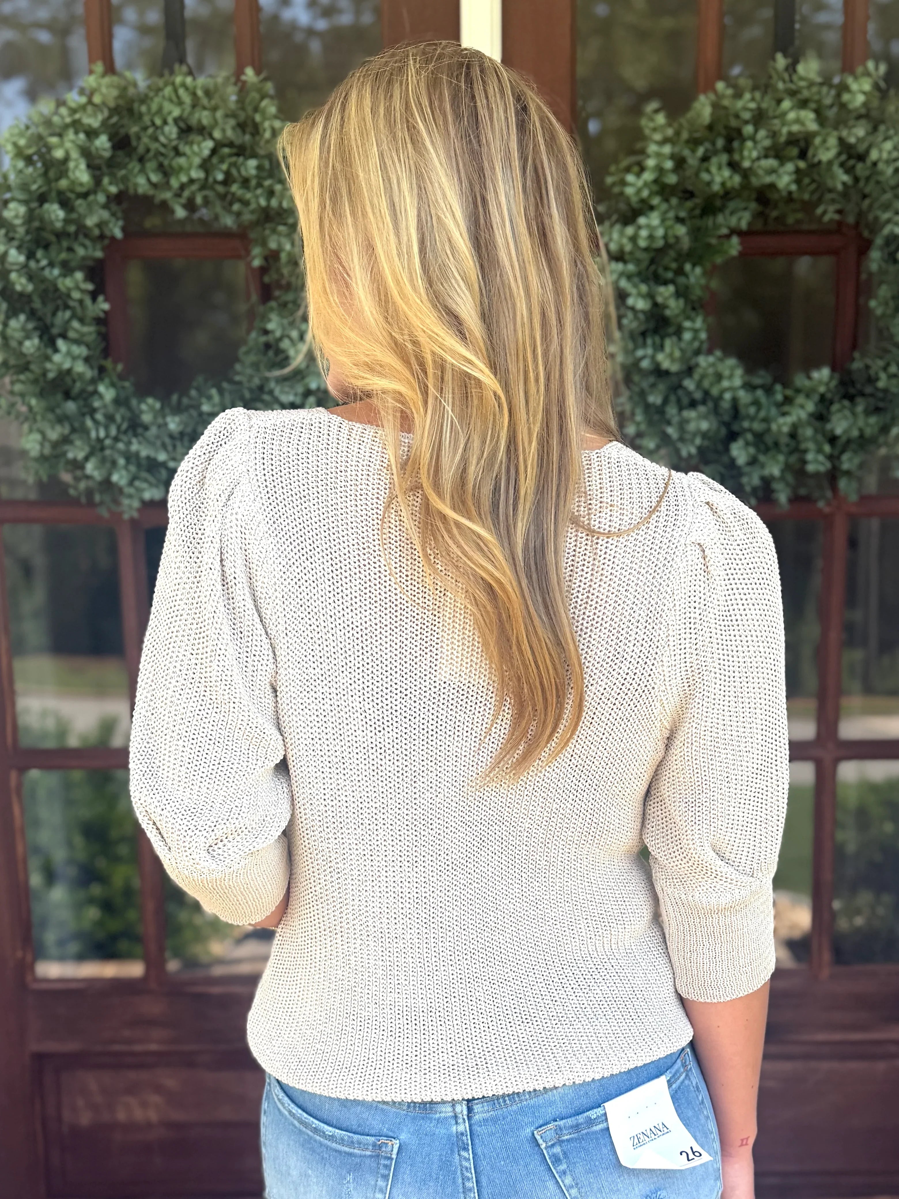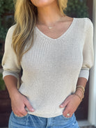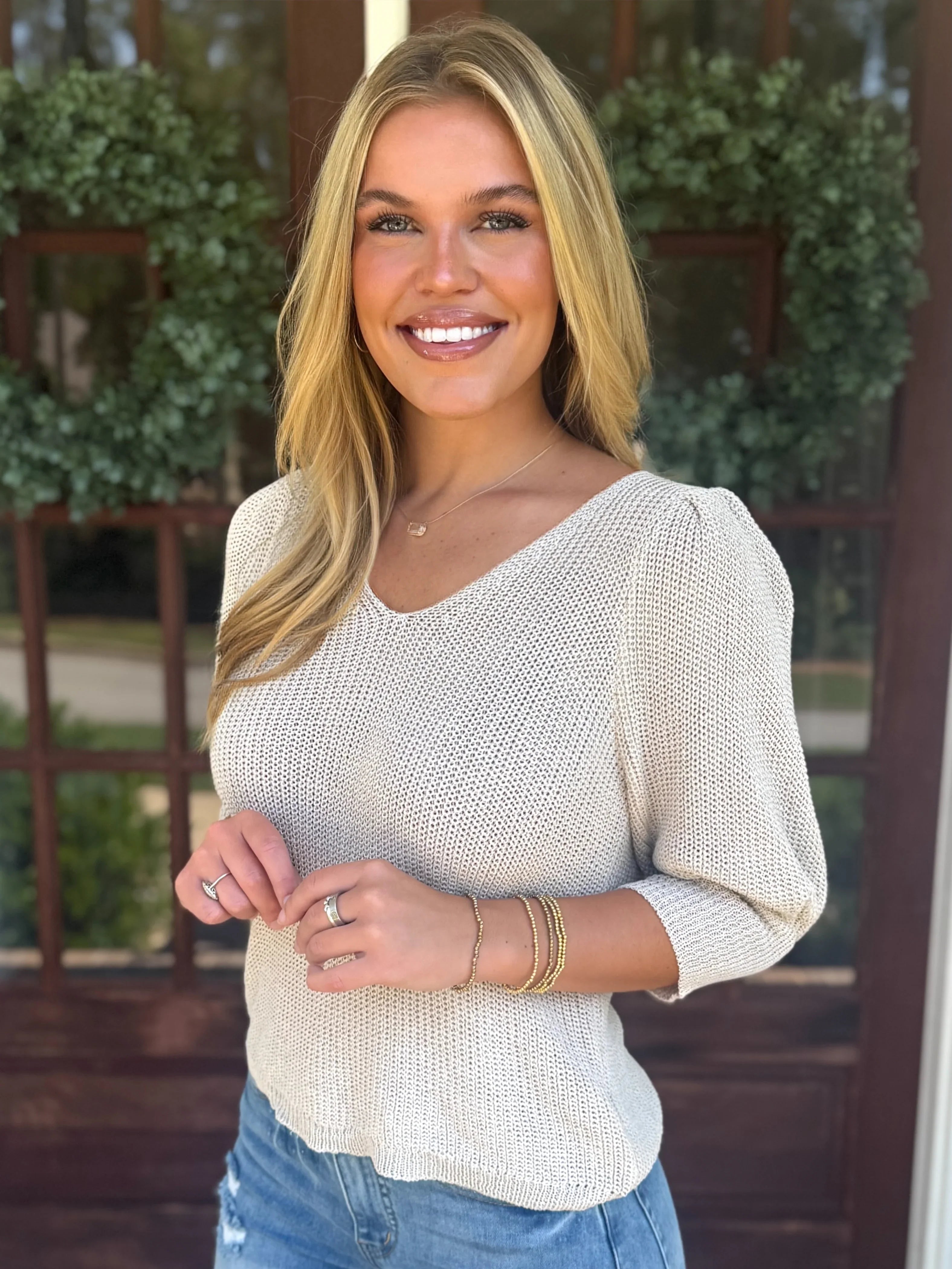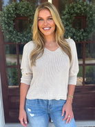 The JORDYN V-Neck Oatmeal Sweater is your playful companion from summer into fall. Featuring a wide V-neck and adjustable peasant sleeves, this semi-sheer, lightweight knit keeps you cool on warm days and layers beautifully as temperatures dip. Enjoy the perfect mix of breezy comfort and stylish charm all season long!