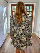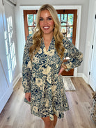 This dress features a playful two-tone print with charming piping accents. It boasts a collared split neckline and long sleeves finished with fluttery ruffles for a fun, flirty touch.