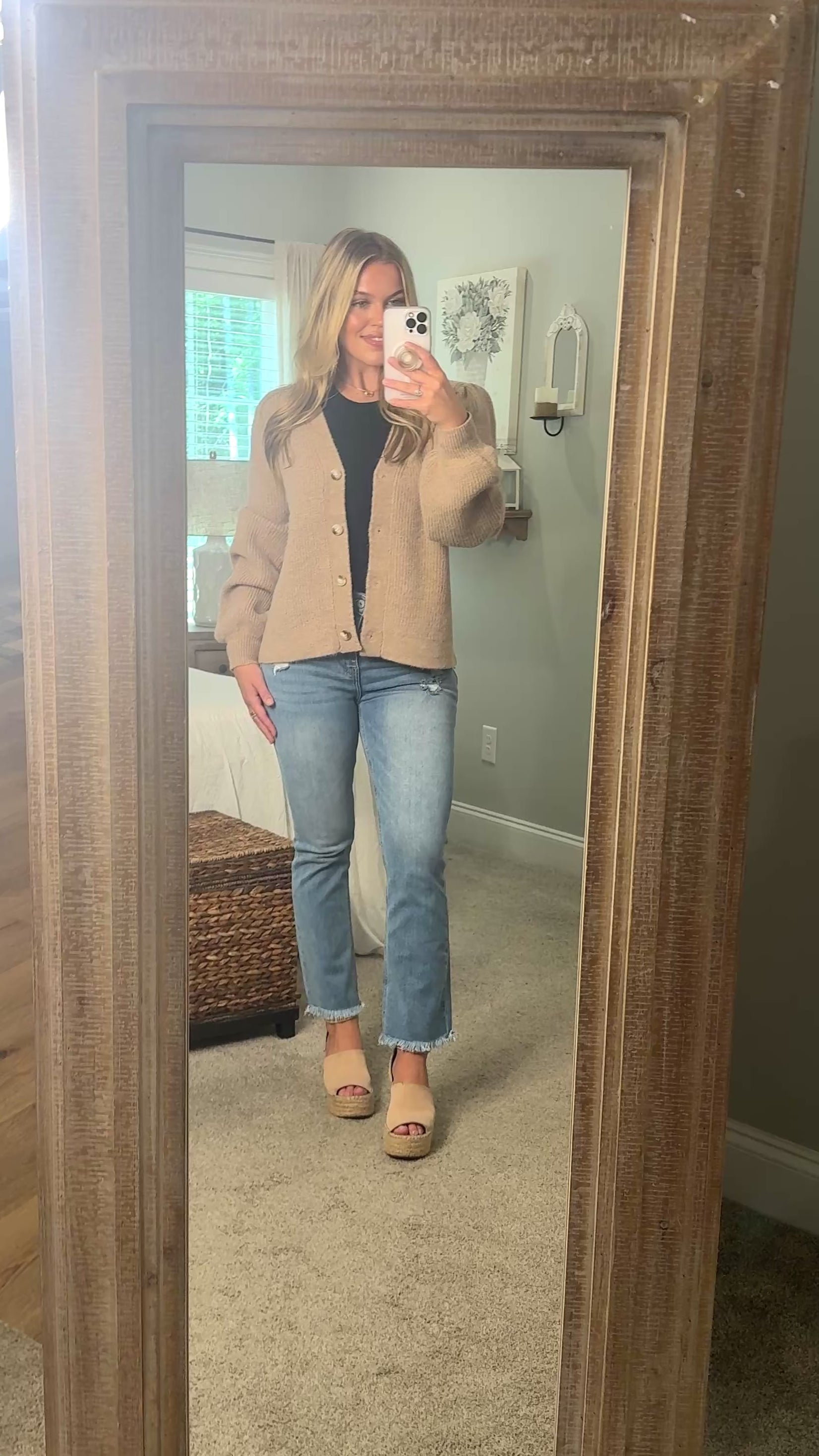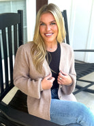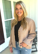 The Palmer Puffy Sleeve Taupe Cardigan Sweater brings playful charm to your everyday look. Crafted from a soft blend of acrylic, nylon, and polyester, this lightweight, non-sheer piece features a flattering V-neck and cute puffed long sleeves with drop shoulders. The ribbed knit details at the sleeve ends and hemline add cozy texture, while buttoned front closure keeps it effortlessly chic. Perfect for layering or wearing solo, it’s your new go-to for added warmth with a fun, flirty twist.